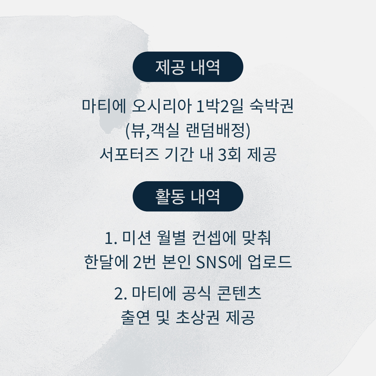 - 기간 내 게시글 등록이 되지 않거나, 서포터즈 활동을 소홀히 하는 경우 마티에 서포터즈 자격이 박탈 될 수 있으며 숙박 비용 전액이 청구 될 수 있습니다.