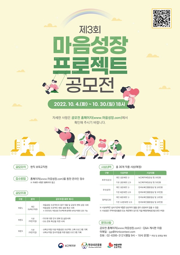 ※ 시상내역(시상 구분, 작품 수)은 수된 작품 수 또는 심사 결과에 따라 조정될 수 있으며, 심사기준에 적합한 당선작이 없을 경우 선정되지 않을 수 있음 ※ 시상금은 지역사랑상품권 또는 제로페이 등으로 지급(제세공과금 본인 부담) ● 응모 일정 - 접수기간 : 2022년 10월 4일(화) \~ 10월 30일(일) 18시 까지 ● 접수 방법 - 응모 신청서 및 개인정보 수집 및 이용동의서 각 1부와 함께 작품 제출 - 홈페이지 접수(www.마음성장.com) ※ 응모 신청서 PDF파일로 제출 ※ 작품은 출품규격에 맞추어 글(사진), 영상으로 제출 ● 유의 사항** - 접수된 작품은 공모전 종료일 이전에 반환을 요청하면 반환이 가능하며, 피사체로부터 초상권 이용에 대해 적법하게 동의를 받았음을 확인함 - 수상작에 대한 모든 저작권에 대해 한국보육진흥원이 활용할 수 있으며, 홈페이지 게재, 교육자료 및 공적용도, 홍보물 제작 등의 목적으로 별도의 비용 지불 없이 수상작을 자유롭게 활용(제작, 전시, 배포 등) 할 수 있음 - 저작권 및 초상권에 저촉되는 경우 심사 대상에서 제외함 ※ 수상 이후 교육에 참여한 이력이 없음이 밝혀지거나, 작성 내용에 대한 허위 사실 및 표절이 확인될 경우 이에 관한 모든 문제는 응모자가 책임지며, 수상 취소 후 상장 및 상금 회수 조치함 - 상금에 대한 제세공과금은 수상자가 부담함