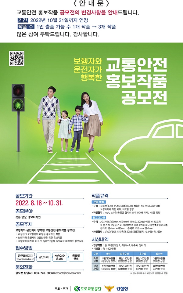 - 공단 홈페이지(www.koroad.or.kr) → 공단소개 → KoROAD 홍보실 → 공모전 안내