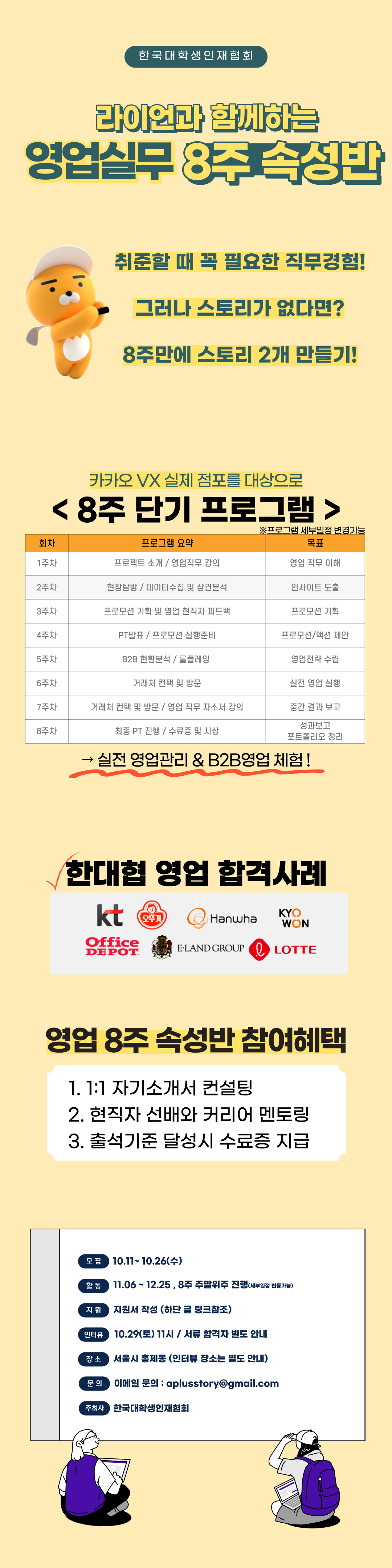 ■ 활동내용 1주차) 프로젝트 소개/ 영업직무 강의 2주차) 현장탐방/ 데이터수집 및 상권분석 3주차) 프로모션 기획 및 영업 현직자 피드백 4주차) PT발표/ 프로모션 실행준비 5주차) B2B현황분석/ 롤플레잉 6주차) 거래처 컨택 및 방문 7주차) 거래처 컨택 및 방문 / 영업 직무 자소서 강의 8주차) 최종 PT진행 / 수료식 및 시상