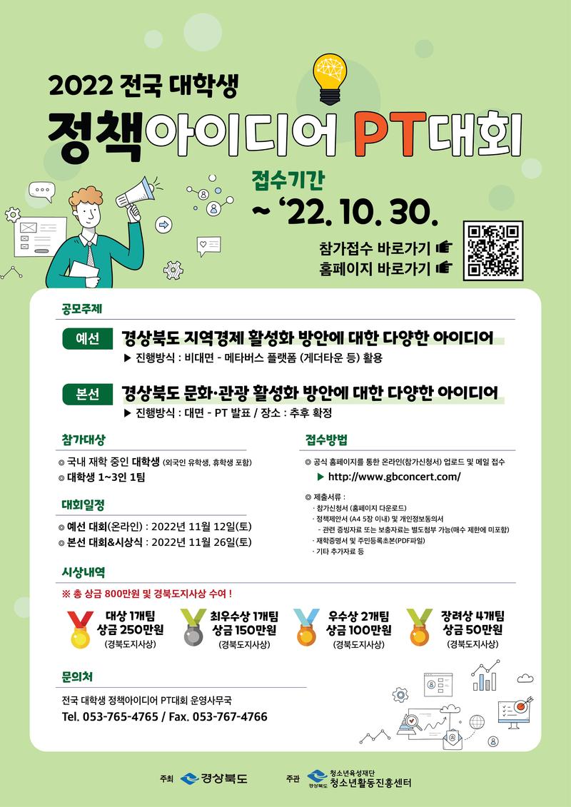 ❍ 행 사 명 : 『2022년 전국 대학생 정책아이디어 PT 대회』 ❍ 장 소 - 예선 : 메타버스 플랫폼 내 온라인 운영 - 본선 : 추후 확정 (안동시내권內) ❍ 일 정 - (1) 홍보 및 접수 9월 5일(월)\~10월 30일(일) - (2) 1차 서류심사 11월 1일(화)\~11월 3일(목) - (3) 예선진출 발표 11월 4일(금) - (4) 진출자 OT 11월 10일(목) - (5) 예선대회(온라인) 11월 12일(토) - (6) 본선&시상식 (오프라인) 11월 26일(토) ❍ 『2022년 전국 대학생 정책아이디어 PT대회』 논제 - 예선 : 경상북도 지역경제 활성화 방안에 대한 다양한 아이디어 - 본선 : 경상북도 문화·관광 활성화 방안에 대한 다양한 아이디어 ❍ 참여대상 : 전국 대학교 재학생 개인 및 1인\~3인 1팀 - 국내 재학 중인 대학생 (외국인 유학생\, 휴학생 포함) ❍ 접수방법 : 공식 홈페이지를 통한 온라인(참가신청서) 업로드 및 메일 접수 ▶ http://www.gbconcert.com/ - 제출서류 : · 참가신청서 (홈페이지 다운로드) · 정책제안서 (A4 5장 이내) 및 개인정보동의서 - 관련 증빙자료 또는 보충자료는 별도첨부 가능(매수 제한에 미포함) · 재학증명서 및 주민등록초본(PDF파일) · 기타 추가자료 등 ❍ 대회형식 - (예선) 비대면 - 메타버스 플랫폼 (게더타운 등) 활용 - (본선) 대 면 - PT 발표 ❍ 심 사 : 서류심사, (예선, 본선) 정책아이디어 PT 대회 ❍ 시상내역 : 경상북도 도시자 상장 및 총상금 800만원 - 대상 1개팀 상금 250만원 (경북도지사상) - 최우수상 1개팀 상금 150만원 (경북도지사상) - 우수상 2개팀 상금 100만원 (경북도지사상) - 장려상 4개팀 상금 50만원 (경북도지사상) ※ 시상금은 제세공과금을 제외한 금액으로 계좌 입금. ❍ 주최 : 경상북도 청소년활동진흥센터 ❍ 문 의 - 정책아이디어 PT대회 운영사무국 Tel. 053-765-4765 / Fax. 053-767-4766