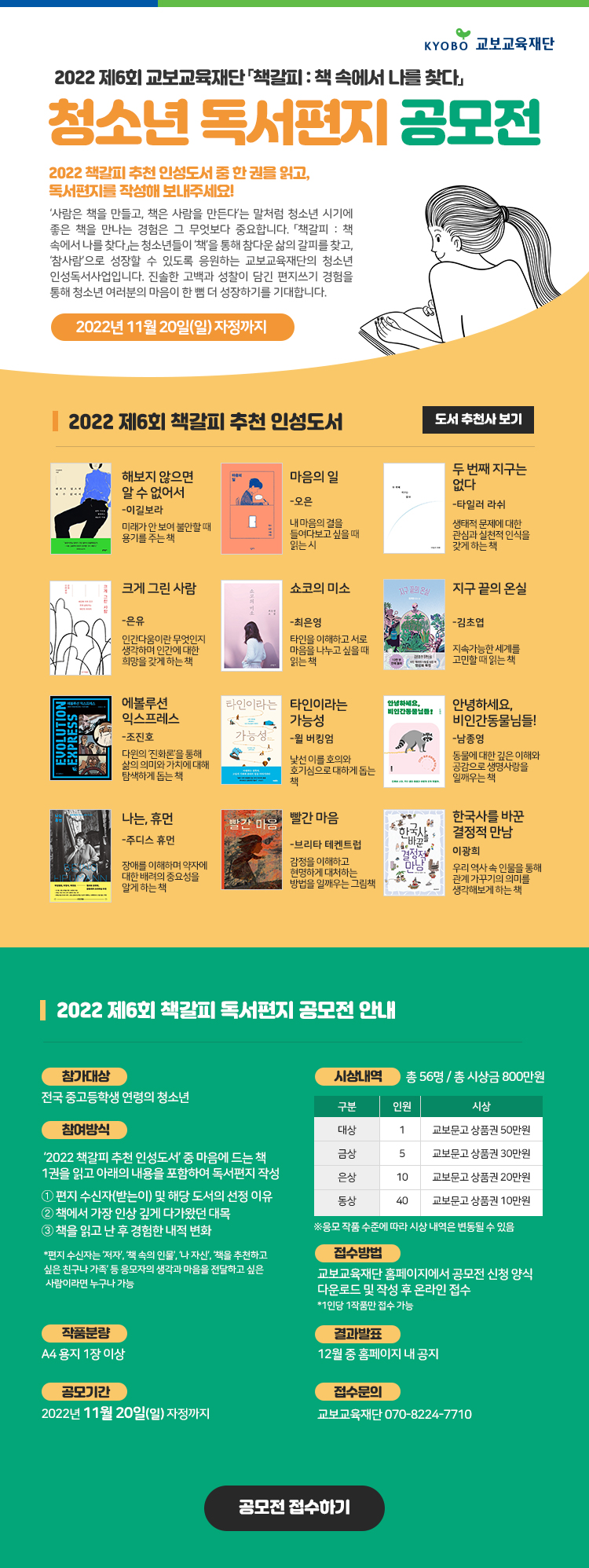 ■ 시상내역 : 총 56명 / 총 시상금 800만원 - 대상(1명) : 교보문고 상품권 50만원\, 상장 - 금상(5명) : 교보문고 상품권 30만원\, 상장 - 은상(10명) : 교보문고 상품권 20만원\, 상장 - 동상(40명) : 교보문고 상품권 10만원\, 상장 ※ 응모 작품 수준에 따라 시상 내역은 변동될 수 있음