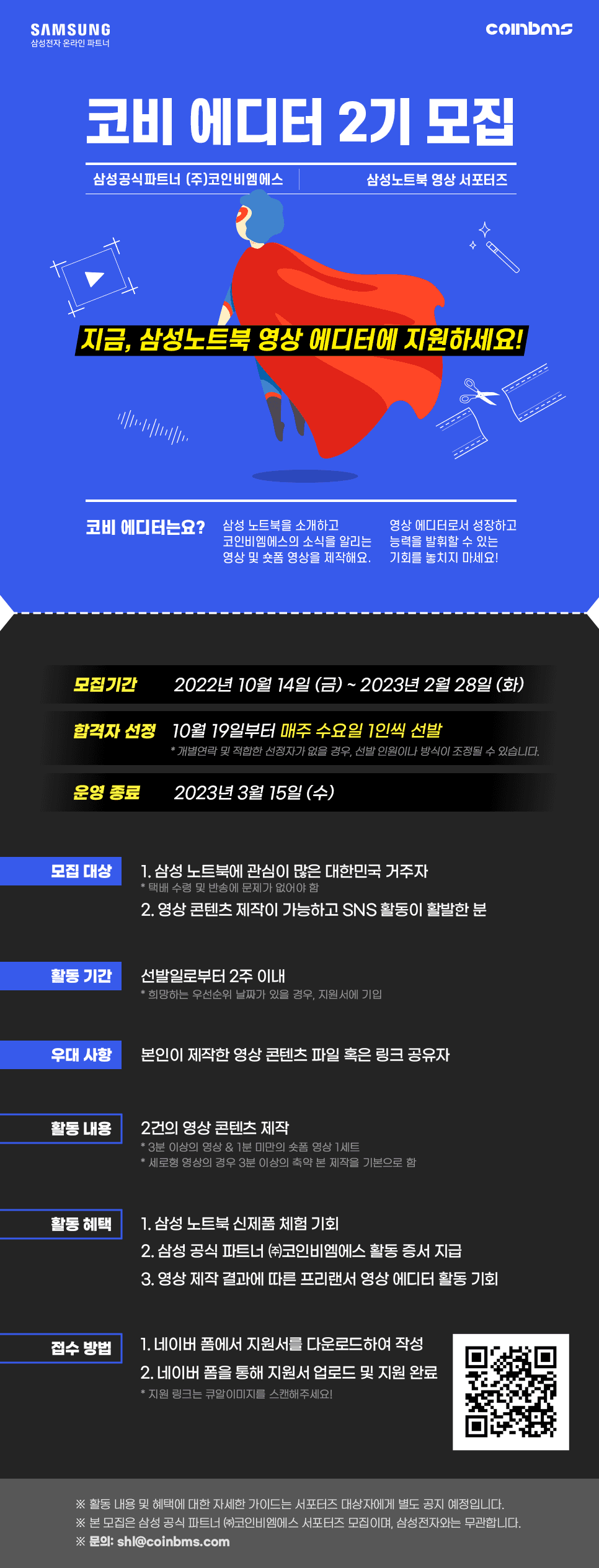 0. 모집 내용 - 모집 기간 : 2022년 10월 14일(금) \~ 2023년 2월 28일(화) (매주 상시 모집) - 합격자 선정 : 10월 19일부터 매주 수요일 1인씩 선발하여 개별 연락 - 운영 종료 : 2023년 3월 15일(수) 1. 모집 대상 - 삼성 노트북에 관심이 많은 대한민국 거주자 (택배 수령 및 반송에 문제가 없어야 함) - 영상 콘텐츠 제작이 가능하고 SNS 활동이 활발한 분 - 우대 사항 : 본인이 제작한 영상 콘텐츠 파일 혹은 링크 공유 시 2. 모집 인원 - 매주 1인씩 선발하여 총 상시 모집 예정 * 적합한 선정자가 없을 경우, 선발인원이나 방식이 조정될 수 있습니다. 3. 활동 기간 - 1주차 :합격자 선정 연락 및 대여 노트북 수령 & 콘텐츠 기획안 피드백 - 2주차 :영상 콘텐츠 제작 및 피드백 & 노트북 회수 및 영상 최종 공유 * 희망하는 우선순위 날짜가 있을 경우, 지원서에 기입 4. 활동 내용 - 2건의 영상 콘텐츠 제작 (3분 이상의 제품 소개 영상 & 1분 미만의 세로형 영상 1세트) * 세로형 영상의 경우 3분 이상의 영상의 축약 본으로 제작을 기본으로 함 5. 활동 혜택 - 삼성 노트북 갤럭시북2 신제품 체험 기회 - 활동 증서 지급 - 영상 제작 결과에 따른 프리랜서 영상 에디터 활동 기회 6. 지원 서류 및 접수 방법 - 네이버 폼에서 지원서를 다운로드하여 접수 - 지원서 다운로드 : http://naver.me/FSO3TAn7 - 네이버 폼 링크 : https://naver.me/GWrtDBnQ 7. 이메일 접수 및 문의처 - 문의 : shl@coinbms.com - 파일명 : 코비에디터_V02_이름 (네이버 폼에 명시 예정)