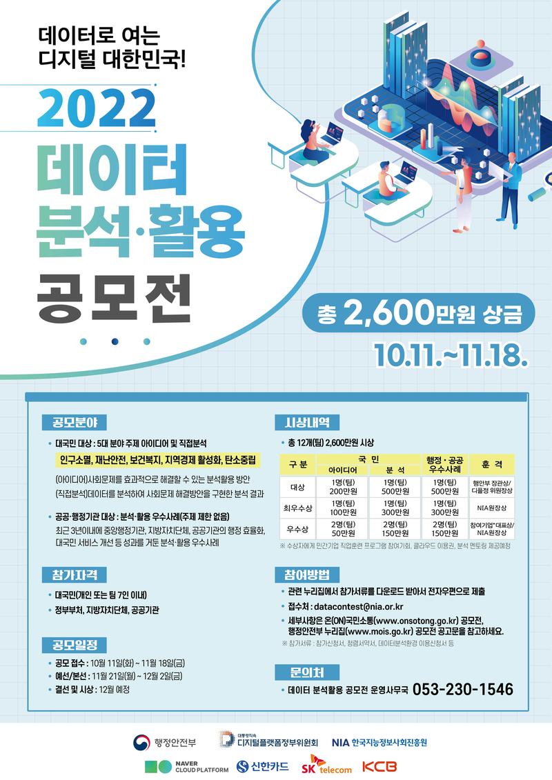 행정안전부에서 ‘2022년 데이터 분석·활용 공모전’을 아래와 같이 개최하오니 많은 참여 바랍니다.