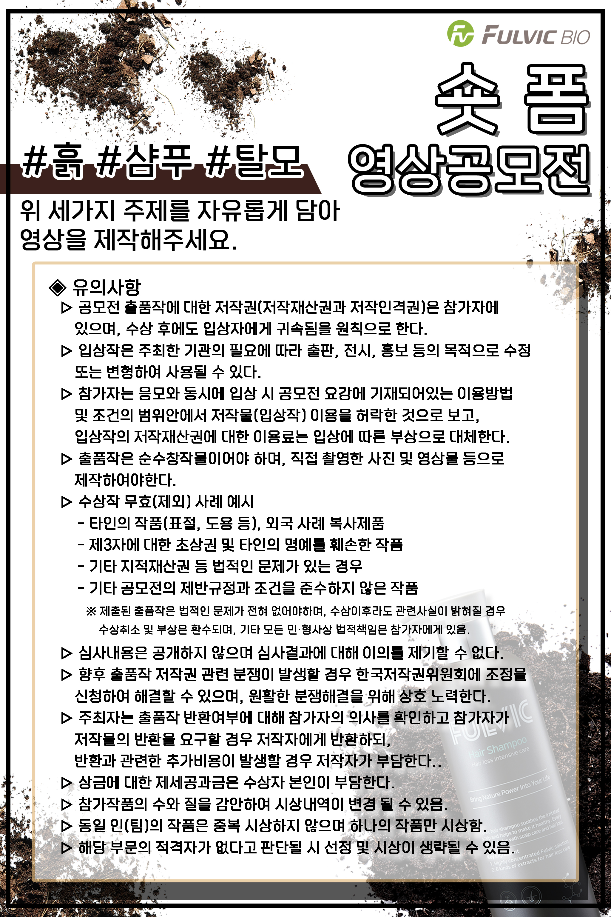 풀빅바이오에서 숏폼영상공모전을 진행합니다. 흙, 샴푸, 탈모 세가지 주제를 자유롭게 담아 영상을 제작해주세요 10월31일까지 참가자격 - 제한없음 시상내역 (총 150만원상당)