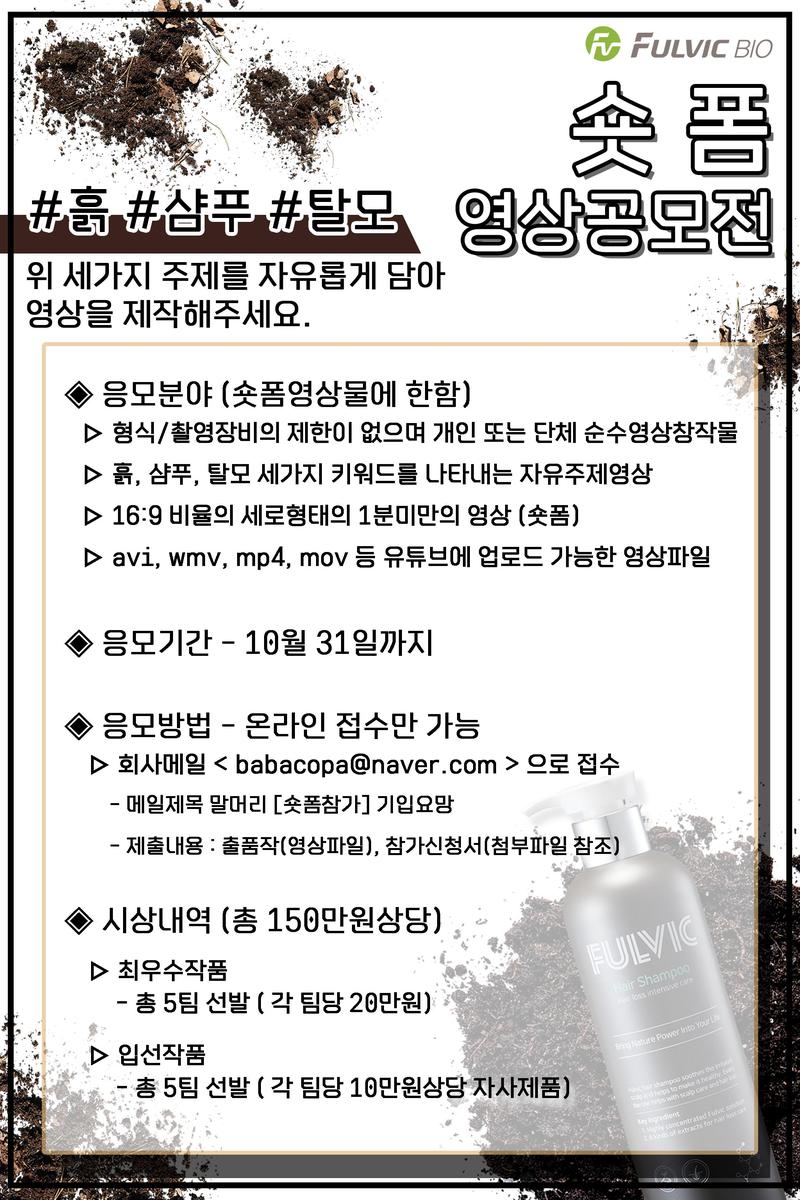 ◈ 응모방법 - 온라인 접수만 가능 ▷ 회사메일 < babacopa@naver.com > 으로 접수 - 메일제목 말머리 [숏폼참가] 기입요망 - 제출내용 : 출품작(영상파일), 참가신청서(첨부파일 참조) 풀빅산,풀빅,풀빅샴푸,풀빅산샴푸,탈모샴푸,탈모케어,두피케어,Fulvic,Fulvicacid,공모전,영상공모전