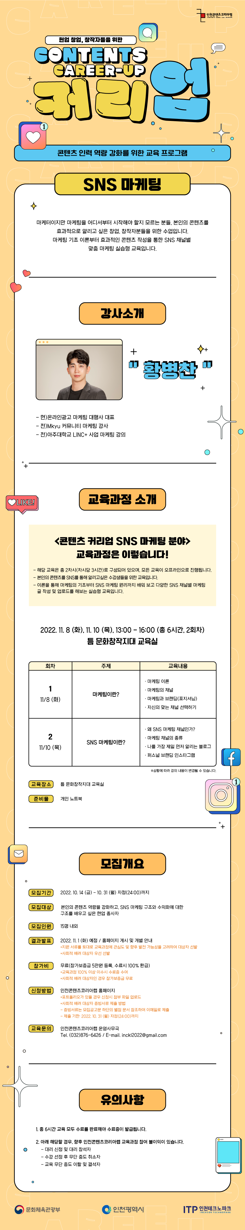 [콘텐츠 커리업 - SNS 마케팅] <쉽게 따라하는 SNS 마케팅> 해당 강의는 마케팅에 '마'짜라도 알아가고자 하는 분들에게 추천드립니다. 마케팅의 기본 지식 개념부터 SNS 마케팅 채널의 특징과 기본 원리를 알려 드리고자 합니다. - 교육 일정: 2022. 11. 8 (화)\, 11. 10 (목)\, 13:00 - 16:00 총 6시간\, 2회차 - 교육 장소: 틈 문화창작지대 교육실 - 모집 기간: 2022. 10. 14 (금) - 10. 31 (월) 자정(24:00)까지 - 모집 대상: 본인의 콘텐츠 역량을 강화하고, SNS 마케팅 구조와 수익화에 대한 구조를 배우고 싶은 현업 종사자 - 모집 인원: 15명 내외 - 신청하기: 인천콘텐츠코리아랩 홈페이지 내 신청하기 - 교육문의: 인천콘텐츠코리아랩 운영사무국 032-876-6426 / inckl2022@gmail.com