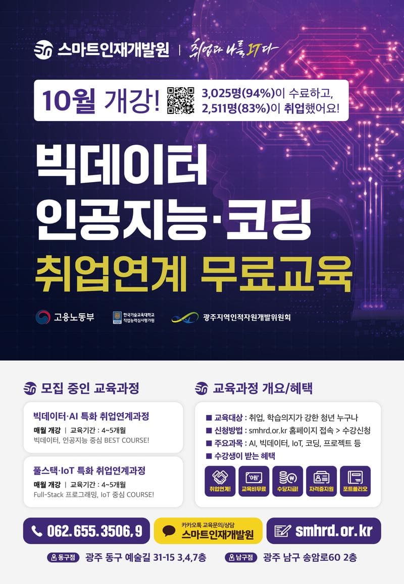 - 취업연계 과정 ☑ 빅데이터 ( 10/27 개강 ) ☑ 인공지능 ( 10/27 개강 ) ☑ Full-Stack ( 10/31 개강 )