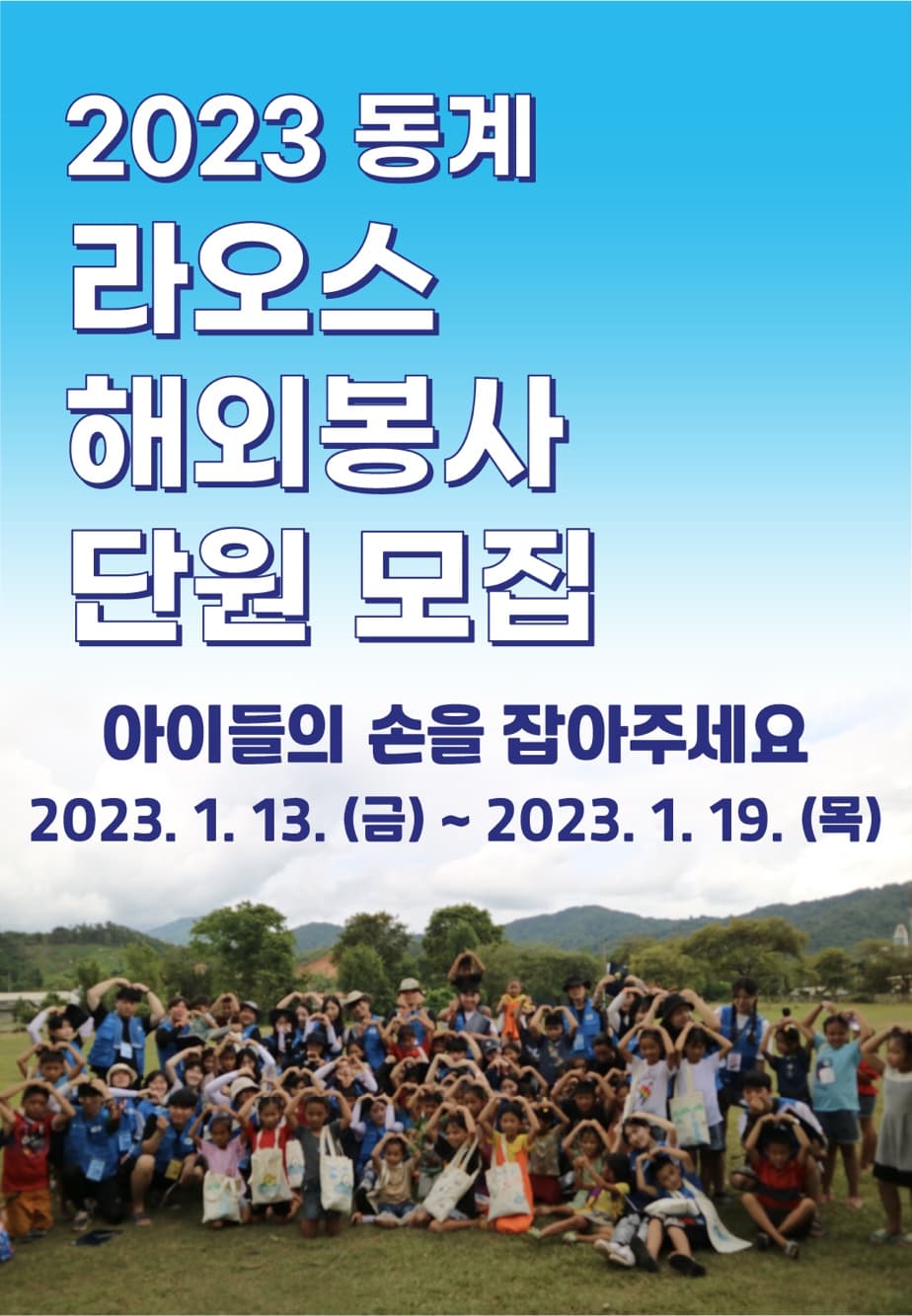 한국청소년진흥협회 2023 동계 라오스 해외봉사&문화체험 참여자 추가모집! 한국청소년진흥협회에서는 2016년부터 6년동안 학교 기업, 단체 등 독도사랑캠페인 참여와 NGO 단체의 도움으로 전 세계 아이들에게 독도사랑필통, 학용품, 응원편지 등 후원물품을 전달하였습니다. 이번 2023년 후원물품을 전달하고 해외교육봉사를 함께 할 해외자원봉사자를 모집합니다! 한국청소년진흥협회의 해외봉사 프로그램은 후원물품을 전달하는 것에서 그치지 않고, 현지의 아이들을 대상으로 하는 재능기부 봉사활동과 문화교류 활동 등 다양한 활동을 진행하고 있습니다. 이런 분들에게 추천합니다. 1.남들과는 다른 봉사활동을 하고 싶은 분 ( 직접 봉사활동 프로그램을 만들 수 있어 특별한 봉사활동 기록을 가질 수 있습니다.) 2. 나의 전공을 보여줄 기회를 찾고 계신 분 ( 재능기부 봉사활동에서는 나만의 전공에 맞게 프로그램을 기획할 수 있어 전공연계 활동을 할 수 있습니다.) 3. 다양한 경험을 해보고 싶은 분 ( 봉사활동뿐만 아니라 문화교류 활동을 통해, 유적지 및 관광지를 방문하고 액티비티 활동을 진행하기 때문에 풍부한 경험을 할 수 있습니다.) 신청기간: 2022.11.30\~2022.12.10 신청방법: 네이버폼 제출 (https://form.office.naver.com/form/responseView.cmd?formkey=YmFlODE1YjYtYmYwMS00YmIxLTk1MGQtYjQxMzQ3YWIxNDUx&sourceId=urlshare) 활동일정: 2023.01.13.(금) \~ 2023.01.19.(목) 5박7일 한국청소년진흥협회 지난 해외봉사 후기가 궁금하시다면 인스타그램(@kypa1025)을 참고해주세요! 자세한 사항은 한국청소년진흥협회 홈페이지를 참고해주세요. 관련된 문의사항은 카카오톡 채널을 통해 문의 부탁드립니다.