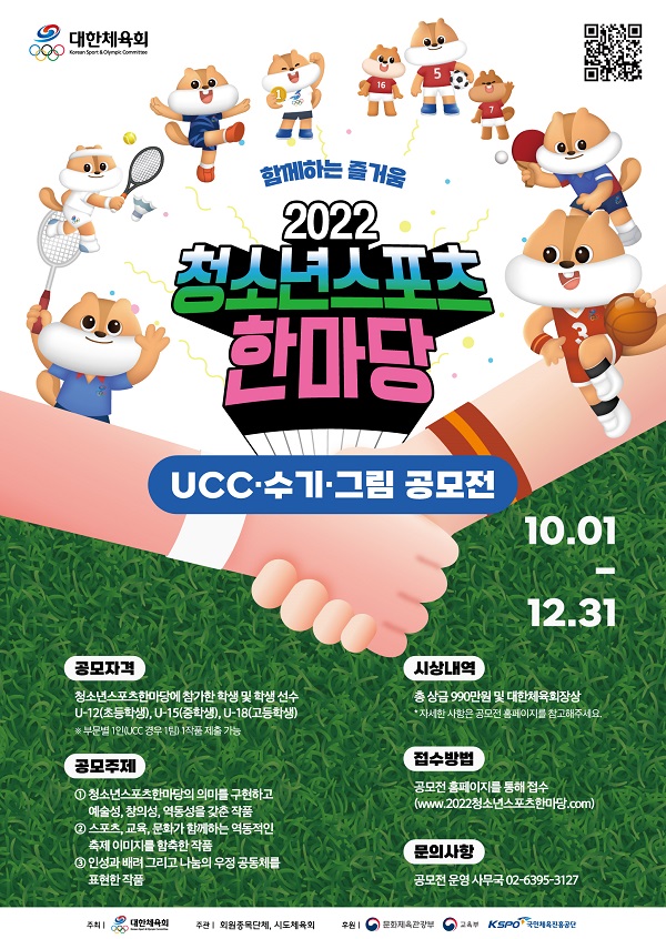 ● 응모 주제 - 청소년스포츠한마당과 관련된 주제 ① 청소년스포츠한마당의 의미를 구현하고 예술성, 창의성, 역동성을 갖춘 작품 ② 스포츠, 교육, 문화가 함께하는 역동적인 축제 이미지를 함축한 작품 ③ 인성과 배려 그리고 나눔의 우정 공동체를 표현한 작품 ● 응모 분야 - UCC·수기·그림 ● 시상 내역** - 총 27명 시상, 총 상금 990만원