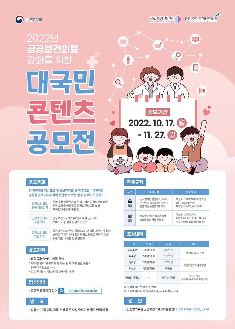 응모주제 - 전 연령대를 대상으로 “공공보건의료”를 이해하고 나아가야 할 방향을 쉽게 시각화하여 전달할 수 있는 영상 및 이미지 콘텐츠 ❶ [공공보건의료 오해 바로잡기] 우리가 생각해왔던 혹은 생각하는 공공보건의료에 관한 오해를 바로잡고 공공보건의료를 쉽고 재미있게 구성한 콘텐츠 ❷ [공공보건의료 경험․인식] 공공보건의료 및 의료인에 대한 인식이나 서비스이용 경험을 담은 콘텐츠 ❸ [공공보건의료 역량 강화] 공공보건의료 종사자들의 고민과 이를 개선하기 위해 노력한 구체적 사례를 혹은 공공보건의료 역량 강화를 위한 제안 내용을 담은 콘텐츠