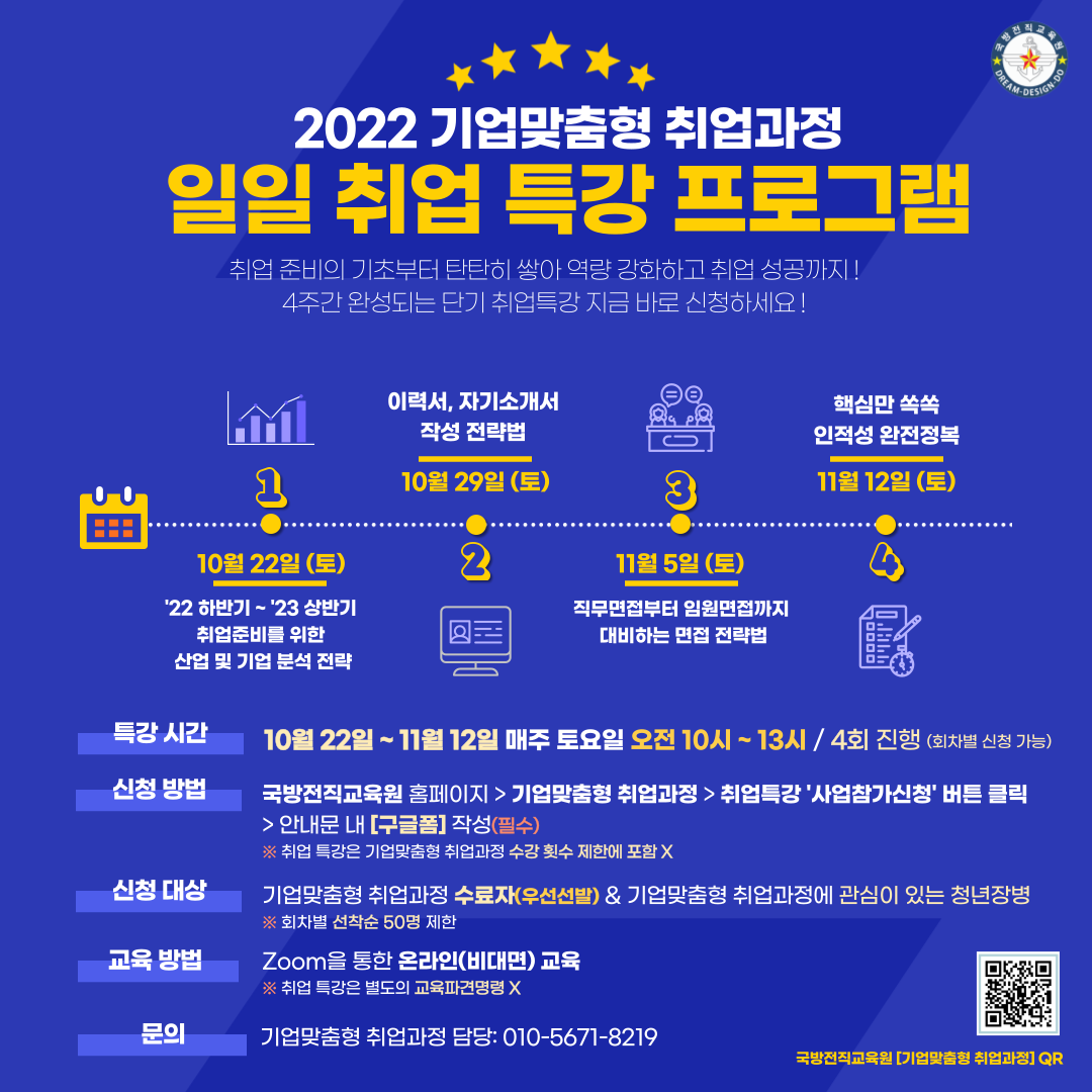 • 접수기간 : \~ '22.11.11. (금) 까지 ※ 특강 신청 후 사전 고지 없이 과정 불참(No Show)시, 추후 국방전직교육원 타과정 신청이 제한됩니다.