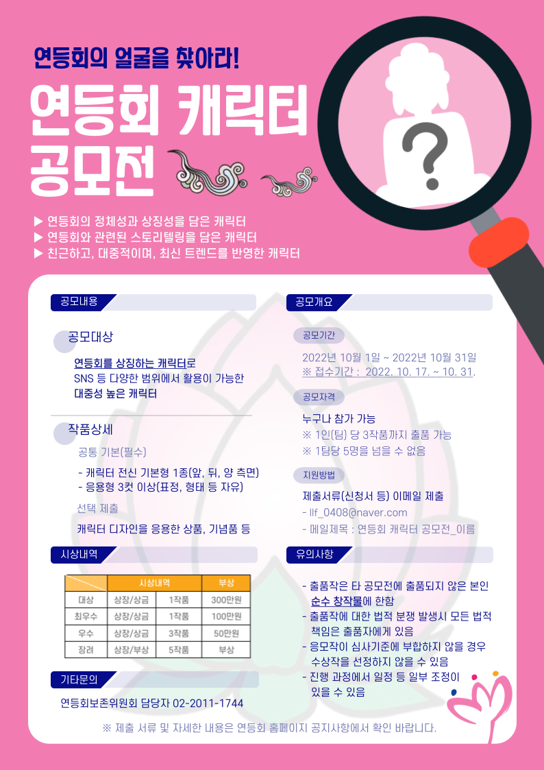 1. 공 모 명 : 연등회 캐릭터 공모전 2. 공모기간 : 2022. 10. 1. \~ 2022. 10. 31.【31일】 *접수기간 : 2022. 10. 17. \~ 2022. 10. 31.【15일】