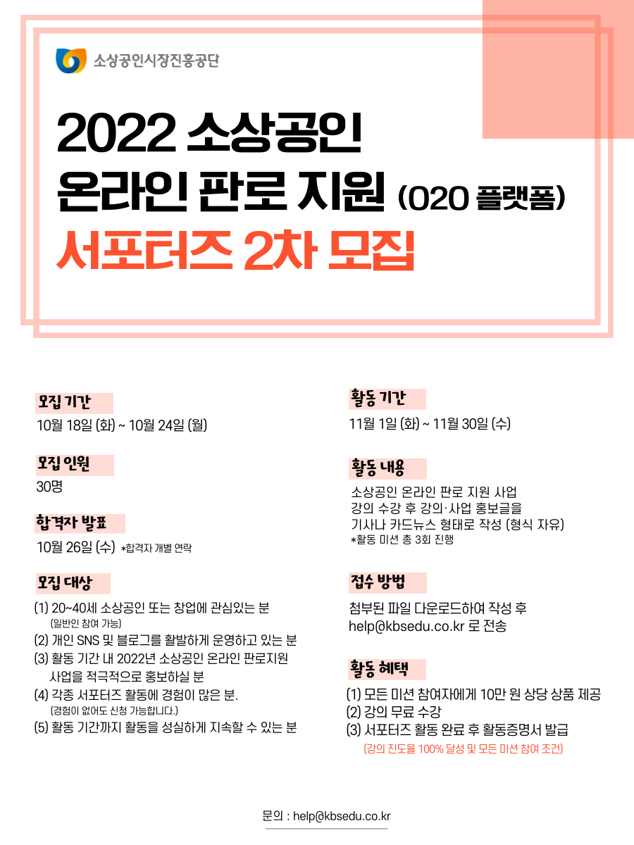 - 모집 기간 : 10월18일 (화) \~ 10월24일 (월) - 모집 인원 : 30명 - 합격자 발표 : 10월26일 (수) *합격자 개별 연락 - 모집 대상 : (1) 20\~40세 소상공인 또는 창업에 관심 있는 분 (일반인 참여 가능) (2) 개인 SNS 및 블로그를 활발하게 운영하고 있는 분 (3) 활동 기간 내 2022년 소상공인 온라인 판로 지원 사업을 적극적으로 홍보하실 분 (4) 각종 서포터즈 활동에 경험이 많으신 분 (경험이 없어도 신청 가능합니다.) (5) 활동기간까지 성실하게 활동을 지속할 수 있는 분 - 활동 기간 : 11월1일 (화) \~ 11월30일 (수) - 활동 내용 : 소상공인 온라인 판로 지원 사업 강의 수강 후 강의\,사업 홍보글을 기사나 카드뉴스 형태로 작성 (형식은 자유) * 활동 미션은 총 3번입니다. - 접수 방법 : 첨부된 파일을 다운로드 하여 작성 후 help@kbsedu.co.kr로 전송 - 활동혜택 : (1) 모든 미션 참여자에게 10만 원 상당의 상품 제공 (2) 강의 무료 수강 (3) 서포터즈 활동 완료 후 활동증명서 발급 (강의 진도율 100% 달성 및 모든 미션 참여 조건)