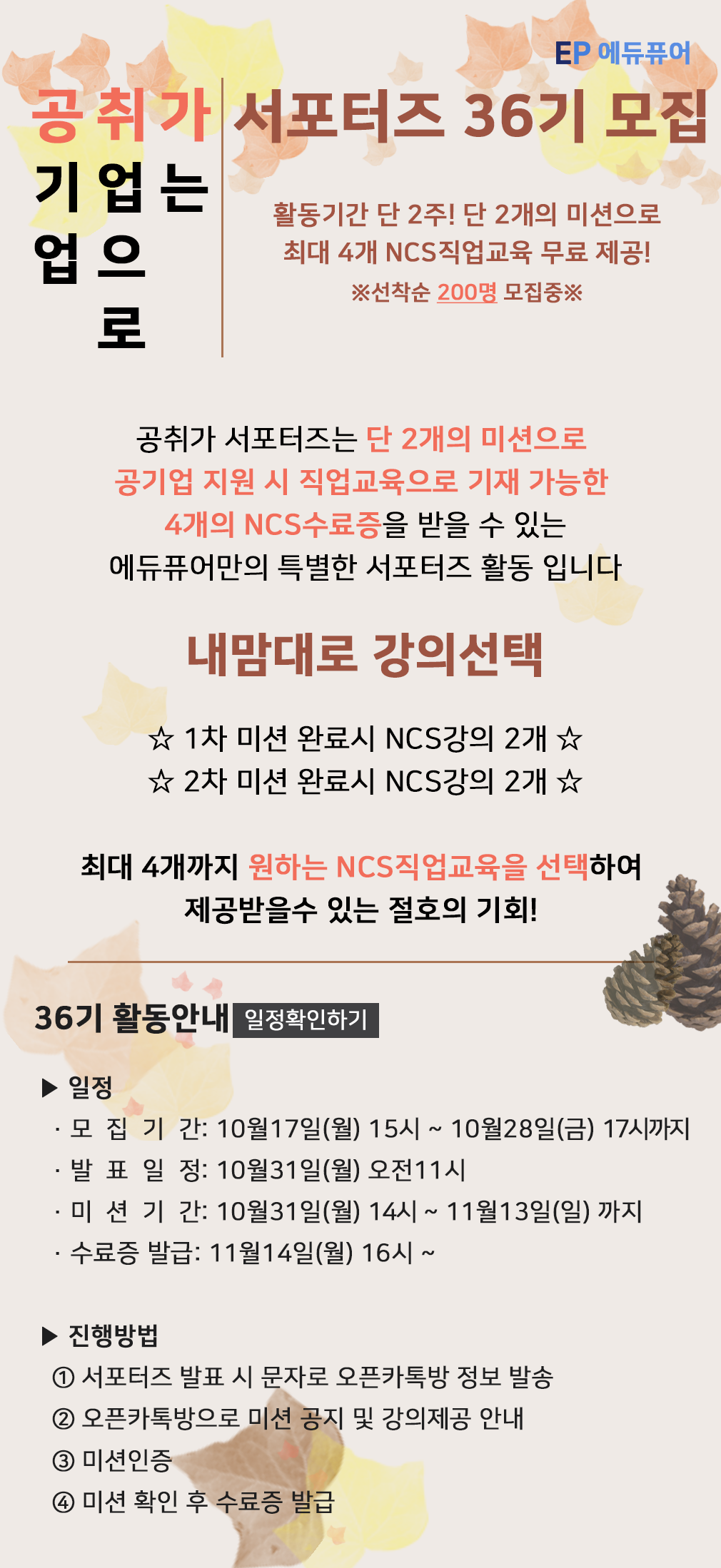 안녕하세요 😁 성공으로 가는 교육 에듀퓨어 입니다. 하반기 대비하실 수 있는 2주간 직업교육 4개를 무료로 제공 받을 수 있는 서포터즈를 소개합니다 🎉