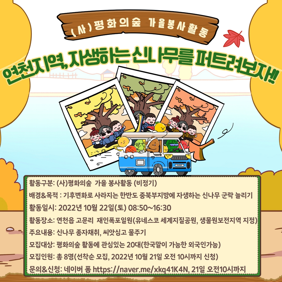어느덧 2022년이 2달 남짓 남은 완연한 가을! 단풍 구경하기에도 좋은 계절입니다. 내장산, 설악산, 주왕산 등 아름다운 산에서의 단풍놀이도 좋지만 평화의숲에서는 조금 더 의미있는 활동을 해보려합니다. 노랗게 물드는 단풍나무과의 #신나무 가 우리나라 일부 #접경지역 에 자라고 있는 것을 아시나요?! 평화의숲은 2022년 가을을 맞이하여, 한반도 중북부지방 계곡부에 자라는 우리나라 신나무 씨앗을 채취해서 내년에 싹이 트면 어린 묘목으로 만들려고 합니다. 신나무 씨앗을 채취에서 땅에 묻고 물을 주는 활동을 함께 하고 싶은 20대 청년들을 기다립니다!
