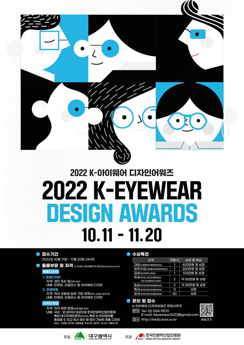 2022 K-아이웨어 디자인어워즈 2022 K-EYEWEAR DESIGN AWARDS 아이웨어 디자인어워즈는 올해로 22회를 맞이하는 대한민국 유일의 아이웨어 디자인 공모전 입니다. 어워즈 운영을 통해 새로운 K-아이웨어 디자인과 디자이너를 발굴하고 한국 안광학의 위상을 높이고자 합니다. ● 행사개요 - 주최/주관 : 대구광역시/한국안광학산업진흥원 - 접수기간 : 2022년 10월 11일 \~ 11월 20일 24:00 ● 출품부문 및 자격 - 제품디자인(Product Design) 1. 컨셉디자인 자격 : 개인 또는 팀(2명 이하) 내용 : 안경테, 선글라스 등 아이웨어 디자인 2. 프로덕트 자격 : 국내 상표권 보유 기업 한정(본사 소재지 한국) 내용 : 안경테, 선글라스 등 아이웨어 디자인 - 시각디자인(Visual Design) 자격 : 자격 제한 없음(실명 출품 원칙) 내용 : 국내·외 바이어 대상으로 한국안광산업진흥원 혹은 대구국제안경전(DIOPS) 혹은 K-아이웨어를 홍보할 수 있고 즉시 생산 및 양산 가능한 제품 디자인 (예시 : 기념품, 문규류, 생활용품, 악세서리, 패키지, 포스터, 리플렛 등) - 공통사항 1. 실명 출품 원칙 2. 내·외국인 모두 참가 가능 3. 출품 부문 상관없이 다수 제품 제출 가능 ※ 단, 중복 수상 불가하며 동일 작품 중복 제출 시 무료 처리 ● 수상자 특전 1. 상장 및 상금 - 대상(1팀) : 400만원 및 상장(산업통상자원부장관상) - 최우수상(1팀) : 300만원 및 상장(산업통상자원부장관상) - 금상(1팀) : 100만원 및 상장(대구광역시장상) - 은상(2팀) : 50만원 및 상장(한국디자인진흥원장상/대구상공회의소장상) - 동상(2팀) : 각 30만원 및 상장 - 특선(00팀) : 상장 - 입선(00팀) : 상장 ● 전체 일정 - 접수기간 : 2022년 10월 11일(화) \~ 11월 20일(일) 24:00까지 - 심사기간 : 2022년 11월 \~ 12월 - 결과발표 : 2022년 12월 20일(화) ※홈페이지 및 수상자 개별 안내 - 시상식 개최 : 2022년 4월 5일\, 대구 엑스코 동관(예정) ● 문의 및 접수 K-아이웨어 디자인어워즈 운영사무국 ≪문의≫ Tel : 02-554-9570 E-mail : keyewear2022@gmail.com ≪접수≫ http://keda.koia.or.kr