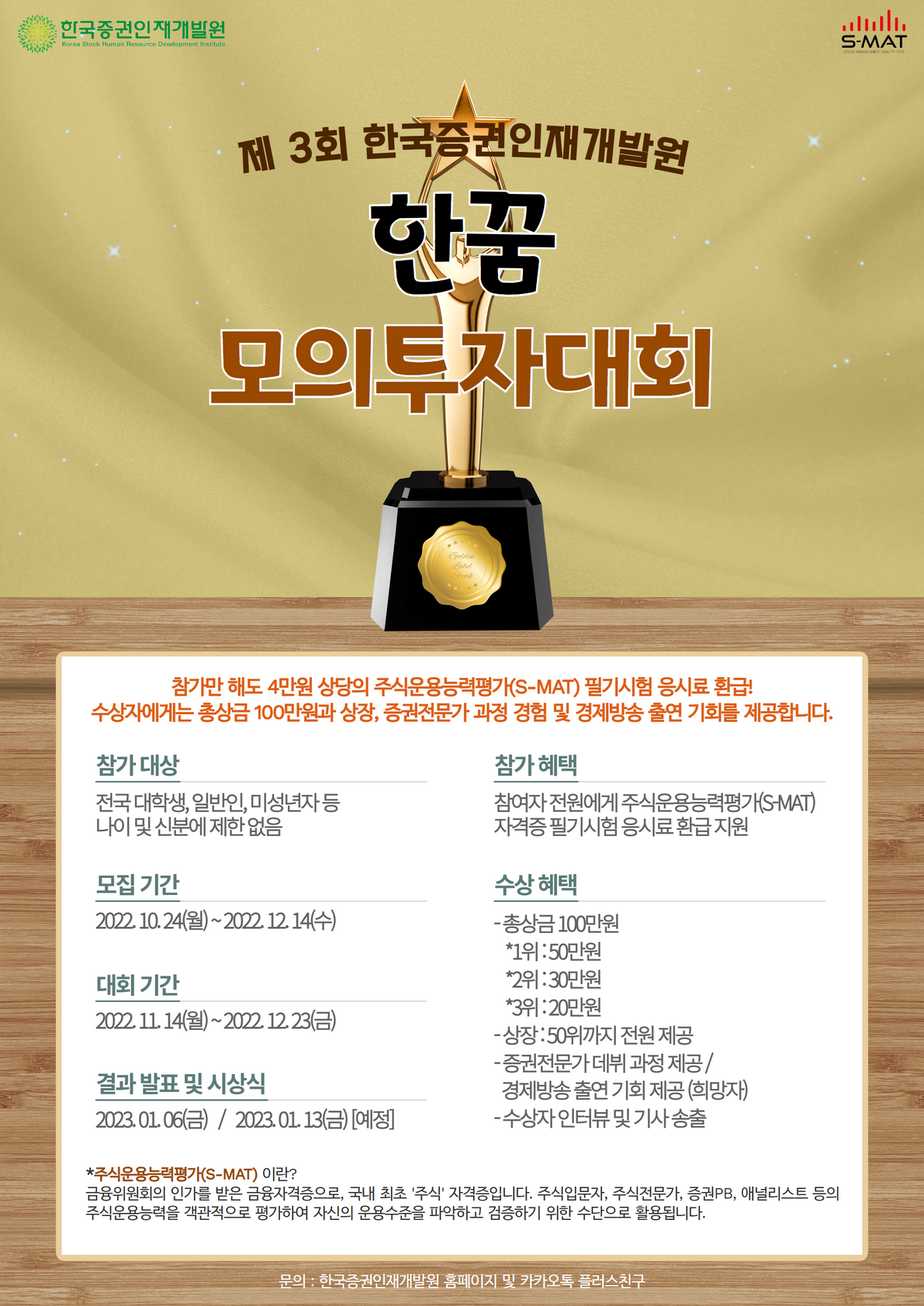 제3회 한국증권인재개발원 ‘한꿈’ 모의투자대회 1등이라는 ‘한꿈’을 향해, ‘한’국증권인재개발원과 함께 ‘꿈’꾸자! 참여만 해도 4만원 상당의 주식운용능력평가(S-MAT) 필기시험 응시료 환급! 수상자는 상금과 상장은 물론 경제방송 출연 기회까지! 모의투자를 통해 자신의 주식운용능력을 평가하고 싶은 모든 이들의 적극적인 참여 바랍니다. <참가대상> 전국 대학생, 일반인, 미성년자 등 나이 및 신분에 제한 없음 <참가방법> *방법(1) 사전신청서 작성! https://forms.gle/iJ8ord64BpEcdsEP7 (추후 접수방법에 대한 메일 및 문자안내 예정) *방법(2) 모집기간 내에 홈페이지에서 신청! https://smat.kr/competition/c_view.php?no=5 (한국증권인재개발원 홈페이지 신청 + 하나증권 모의투자대회 신청) <모집기간> 2022. 10. 24(월) \~ 2022. 12. 14(수) [10.17(월)부터 사전신청서 제출가능] <대회기간> 2022. 11. 14(월) \~ 2022. 12. 23(금) <참가혜택> *참여자 전원* 4만원 상당의 주식운용능력평가(S-MAT) 필기시험 응시료 환급 지원 *수상자 특전* 1. 총상금 100만원 - 1위 : 50만원 / 2위 : 30만원 / 3위 : 20만원 2. 상장 (50위까지 전원 제공) 3. 증권전문가 데뷔 과정 및 경제방송 출연 기회(희망자) 4. 수상자 인터뷰 및 기사 송출 <결과발표> 2023. 01. 06(금) <시상식> 2023. 01. 13(금) [예정] <평가기준> - 모의투자대회 순위는 “수익률”로 정해집니다. - 대회 종료일 종가 기준 누적투자수익률로 최종 순위 결정 <문의> 한국증권인재개발원 카카오톡플러스친구 또는 1:1 문의 *자세한 사항은 홈페이지를 참고 바랍니다. https://smat.kr/competition/c_view.php?no=5