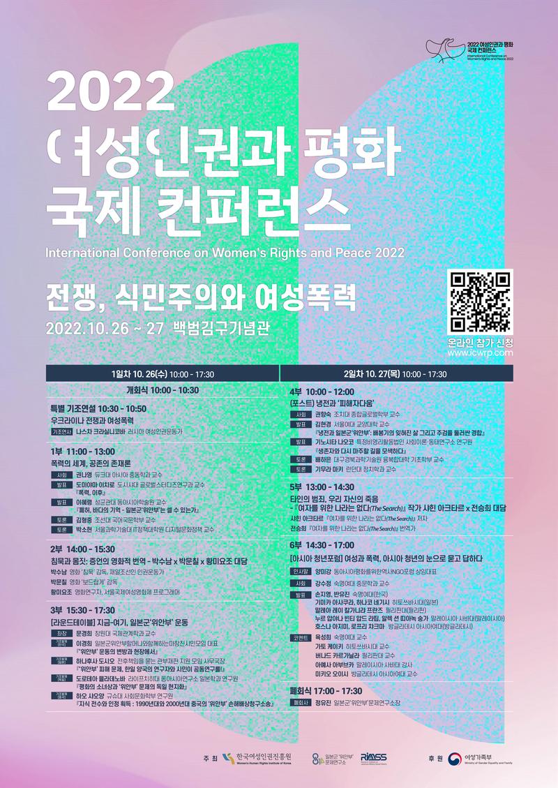 한국여성인권진흥원 일본군’위안부’문제연구소에서 주최하는 <2022 여성인권과 평화 국제 컨퍼런스> 안내 드립니다. 국내외 30여명의 교수, 연구자, 활동가, 감독들이 참여하는 자리를 마련하였습니다. 많은 관심 부탁드리겠습니다. -------------------------------------------- [2022 여성인권과 평화 국제 컨퍼런스]가 10월 26일부터 27일까지 일본군’위안부’문제연구소 유튜브채널에서 라이브 스트리밍 됩니다. #여성인권 #여성폭력 #전시성폭력 #여성의 말하기 #여성연대 분야에서 활동 중이신 국내외 30여명의 교수, 연구자, 활동가, 감독, 작가들이 참여하는 자리를 마련하였습니다. 지금 바로 공식홈페이지(www.icwrp.com)에서 사전등록하세요! **사전등록하신 분들 대상으로 당일 발표자료집을 다운받으실 수 있는 링크를 보내드립니다. **부대행사로 평소에 접하기 힘들었던 영화들을 모아 온라인영화제가 개최됩니다. **www.icwrp.com에서 연사 정보 확인하시고, 아홉 편의 영화도 감상하세요! 행사명 : 2022 여성인권과 평화 국제 컨퍼런스 일시 : 2022. 10. 26(수) \~ 27(목) 오전 10시부터 오후 5시 30분까지 주제 : 전쟁, 식민주의와 여성폭력 **1일차 10.26(수) 10:00\~17:30 [기조연설] 나스차 크라실니코바, 러시아 여성인권운동가 “우크라이나 전쟁과 여성폭력” [1부] 폭력의 세계, 공존의 존재론 - 권나영(듀크대), 도미야마 이치로(도시샤대), 이혜령(성균관대), 김형중(조선대), 박소현(서울과학기술대) [2부] 침묵과 몸짓: 증언의 영화적 번역 – 박수남x박문칠x황미요조 대담 [3부] 라운드테이블, 지금-여기, 일본군’위안부’운동 - 문경희(창원대), 이경희(일본군위안부할머니와함께하는마창진시민모임), 하나후사 도시오(전후책임을 묻는 관부재판 지원모임), 도로테아 믈라데노바(라이프치히대), 하오 샤오양(규슈대) **2일차 10.27(목) 10:00\~17:30 [4부] (포스트) 냉전과 ‘피해자다움’ - 권향숙(조치대), 김현경(서울여대), 기노시타 나오코(특정비영리활동법인 사회이론· 동태연구소), 배하은(대구경북과학기술원), 기무라 마키(런던대) [5부] 타인의 범죄, 우리 자신의 죽음-『여자를 위한 나라는 없다(The Search)』 작가 샤힌 아크타르x전승희 대담 [6부] 아시아청년포럼-여성과 폭력, 아시아 청년의 눈으로 묻고 답하다 - 아시아 5개국 청년 발표와 멘토 코멘트 #여성인권 #여성폭력 #컨퍼런스 #전시성폭력 #여성의 말하기 #여성연대