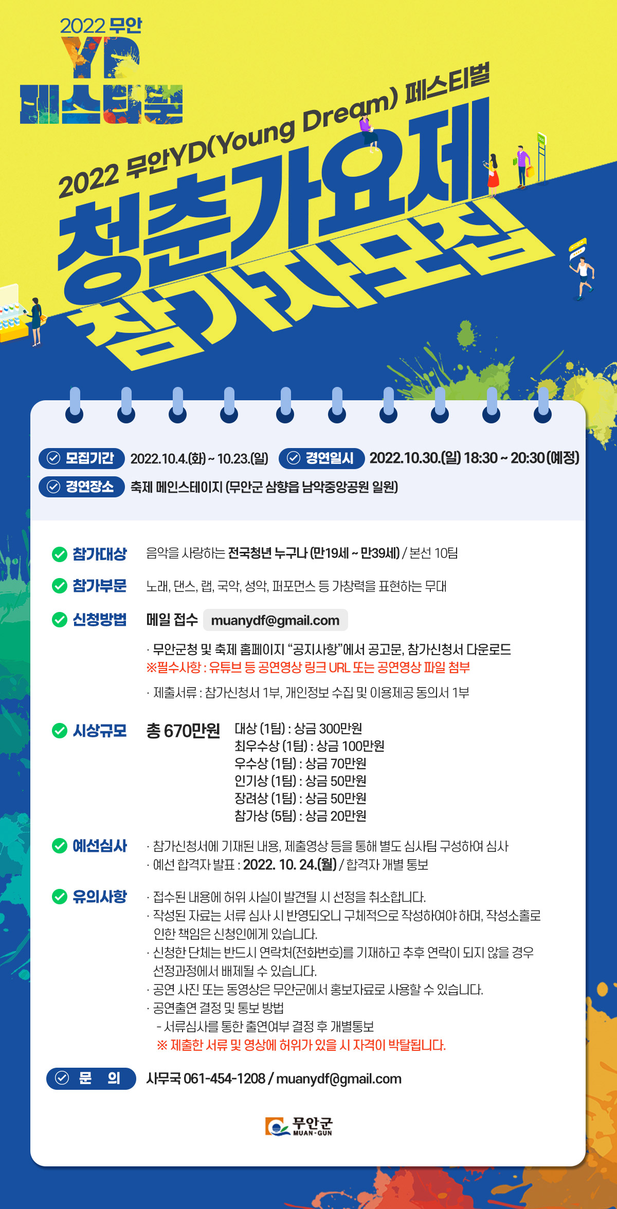 제2회 무안YD페스티벌 청춘가요제 참가자 모집 ● 응모 자격 - 음악을 사랑하는 전국청년 누구나 (만19세\~만39세) / 본선 10팀 ● 응모 주제 - 제2회 무안YD 페스티벌 청춘가요제 ● 시상 내역 * 시상규모 총 670만원 - 대상(1팀) 300만원 - 최우수상(1팀) 100만원 - 우수상(1팀) 70만원 - 인기상(1팀) 50만원 - 장려상(1팀) 50만원 - 참가상(5팀) 20만원 ● 응모 일정 - 2022. 10. 4.(화)\~10. 23.(일) - 2022. 10.24.(월) - 예선 합격자 발표 - 2022. 10.30.(일) - 본선 경연 ● 접수방법 - 메일 접수 / muanydf@gmail.com - 무안YD페스티벌 홈페이지에서 공고문 참가신청서 다운로드 (http://www.무안yd페스티벌.com) ● 심사 방법 - 예선심사 : 참가신청서에 기재된 내용, 제출영상 등을 통해 별도 심사팀 구성하여 심사 - 예선 합격자 발표 : 2022. 10. 24.(월) / 합격자 개별 통보 - 본선심사 : 전문 심사위원 배정 심사기준에 의거하여 평가 ● 유의 사항 - 접수된 내용에 허위 사실이 발견될 시 선정을 취소함 - 작성된 자료는 서류 심사 시 반영되오니 구체적으로 작성하여야 하며, 작성소홀로 인한 책임은 신청인에게 있음 - 신청한 단체는 반드시 연락처(전화번호)를 기재하고 추후 연락이 되지 않을 경우 선정 과정에서 배제될 수 있음 - 공연 사진 또는 동영상은 무안군에서 홍보자료로 사용할 수 있음 - 공연출연 결정 및 통보 방법 - 서류심사를 통한 출연여부 결정 후 개별통보 ※ 제출한 서류 및 영상에 허위가 있을 시 자격이 박탈됨 ● 문의 사항 - 사무국 061-454-1208 / muanydf@gmail.com