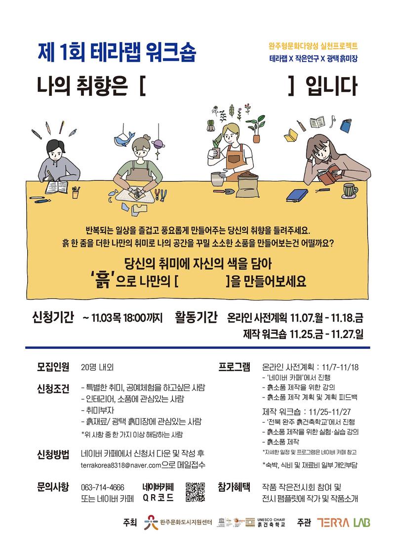 제 1회 테라랩워크숍 모집 공고문 일반대중이 흙집 짓기 교육을 받아도 실생활에 적용하기까지 쉽지 않습니다. 그래서 테라랩(terra: 불어로 ‘흙’을 의미+ lab: 연구실험실)에서는 취미와 흙이 결합 된 소품을 제작하는 생활예술워크숍을 통해 흙건축에 쉽게 다가갈 수 있는 기회를 마련하였습니다. 자연 재료인 흙을 연구하고 실험하는 과정을 통해 거대한 덩어리인 흙집짓기에서 잠시 벗어나 작은 조각의 흙소품 만들기로 다양한 흙건축 문화를 만들고자 합니다. 남녀노소 상관없이 누구나 흙건축에 관심을 갖고 생활 속에 활용 할 수 있는 새로운 문화가 자리 잡을 수 있기를 희망합니다. 이를 통해 흙건축 전문가와 흙건축 생활예술가가 더 많이 탄생 할 수 있기를 기대합니다. 이 워크숍을 통해 만들어진 제작 된 작품들은 작은 전시회에 전시 할 예정입니다. 신청조건 -특별한 취미, 공예체험을 하고싶은 사람 -인테리어, 소품에 관심있는 사람 -취미부자 -흙재료/ 광택 흙미장에 관심있는 사람 *위 사항 중 한 가지 이상 해당하는 사람 20명 내외 모집예정 추진일정 -모집기간: 11월 3일(목) 18시 까지 -참가자 확정안내: 11월 4일(금) *개인부담금 입금확인자를 대상으로 카페 등업 및 개별연락 예정 -온라인 사전계획: 11월 7일(월)-11월 18일(금) -제작 워크숍: 11월 25일(금)-11월 27일(일) -전시회 일정: 12월 예정 (*작은 전시회를 위한 공간 대관 후 공지 예정) 지원방법 -테라랩 카페에서 신청서 양식 다운로드 및 작성 후 하단 메일로 제출 -신청 메일: terrakorea8318@naver.com *(필수) 신청서 첨부: 이름(생년월일)_테라랩 워크숍 참가신청서 (예시: 김테라(910203)_테라랩 워크숍 참가신청서) *지원서의 경우 PDF로 변환 후 제출 참가혜택 -흙건축 전문가 강의 및 광택 흙미장 교육참여 -새로운 취미 배우기 (스테인드글라스, 우든펜, 소품제작을 위한 다양한 공구사용법 교육) -제작 워크숍에서 만든 작품 작은 전시회 참여 -작은 전시회 팸플릿에 작가 기재 및 작품소개 *전시가 끝난 작품은 개인 소장 가능합니다. 프로그램 내용 -오리엔테이션: 11월 5일(토) *비대면 온라인 진행 1부: 워크숍 및 참가자 소개 2부: 주요활동 안내 -온라인 사전계획: ‘네이버 카페’에서 진행 흙소품 제작을 위한 온라인 이론 강의 흙소품 제작 계획 및 계획 피드백 -제작 워크숍: ‘흙건축학교 실내실습장’에서 진행 (전라북도 완주군 용진읍 완주로 462-9) 흙소품 제작을 위한 실험·실습 강의 >자세한 프로그램은 온라인 사전계획 기간에 공지예정 흙소품 제작 *제작워크숍 기간 중 숙박, 식비 및 재료비 일부 개인부담 (자세한 사항은 전화문의 바람) 문의 063-714-4666 (화-금 10:00-17:00) 또는 네이버카페 ‘문의게시판’ 교육 중에는 통화가 어려우니 부재중 시 네이버카페 ‘문의게시판’을 이용해주시기 바랍니다. 네이버 카페: hhttps://cafe.naver.com/terralabxhobby