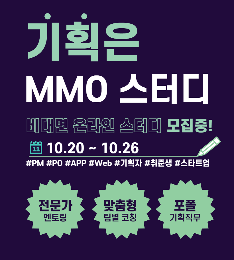 안녕하세요, 현재 IT PM/PO직 및 기획교육을 진행하고 있는 송사장입니다. 여러분들께 "온라인으로 진행되는 스터디"를 소개합니다! . 기획이란 무엇일까요? 사업기획, 상품기획, APP기획 등등 우리가 만나는 모든 서비스에는 기획이 들어갑니다. 기획은 그럼 어디서 공부하시나요? . 혼자공부하기 어려우시죠? 나는 잘하고 있는가 고민되시나요? 제가 스터디 그룹을 운영하는 이유는 [공감]하기 때문입니다. 사람들을 만나기 어려운 시기에 온라인으로 우리의 크루를 만나보세요! . 우리의 스터디그룹은 개인의 발전과 실무자의 멘토링이 함께 이뤄지는 활동입니다. 창업부터 취업, 이직, 관리직급까지의 경험을 바탕으로 진행되는 멘토링을 만나보세요! . 스터디그룹은 3명씩 1팀이 되며 주제가 맞는사람끼리 모여 팀빌딩이 됩니다. 우리의 스터디그룹은 개인의 발전과 실무자의 멘토링이 함께 이뤄지는 활동입니다. 스터디그룹은 3명씩 1팀이 되며 주제가 맞는사람끼리 모여 팀빌딩이 됩니다. . *모집기간 : 2022.10.20 \~ 2022.10.26 . *선정발표일 : 2022.10.27 . *팀빌딩 및 OT : 2022.10.28 . *모집인원 : 총 30명 개인별 지원이며 팀빌딩은 MMO에서 진행해드립니다. . *스터디 진행기간 : 2022.10.28 \~ 2022.11.25 (연장가능) 신청만해도 기획관련 IT기획정보를 받아볼 수 있는 정보단체방에 초대해드립니다. 해당 단체방에서는 MMO 진행프로그램의 할인 및 현직자들의 Q&A를 진행해드립니다. . *주제