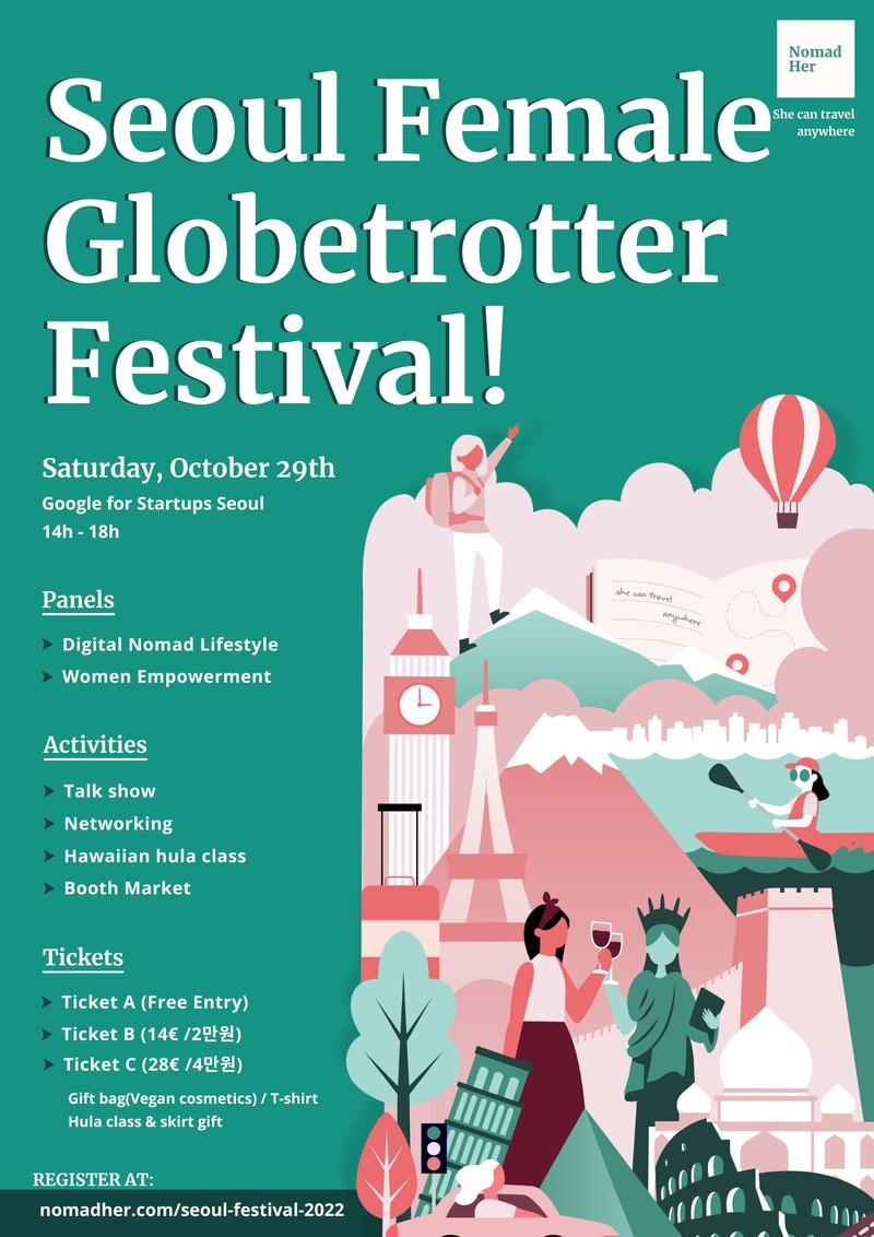 여성 여행자를 위한 페스티벌 들어보신 적 있으신가요? 전세계 172개국, 15000명 이상의 여성 여행자들이 안전한 혼자 여행을 위해 사용하는 커뮤니티 앱으로 성장한 노매드헐이 She Can Travel Anywhere 라는 주제로 오는 10월 29일 삼성역 근처 구글 스타트업 캠퍼스에서 서울 여성 여행자 페스티벌을 개최합니다!