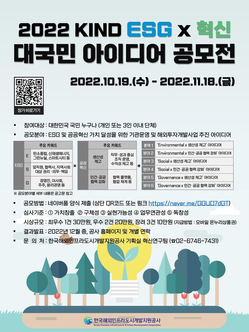 ■ 공모전 개요 1) 대회명 : 2022 KIND ESG x 혁신 아이디어 공모전 2) 참여대상 : 국민 누구나(개인 또는 3인 이내 단체) 3) 공모기간 : 2022.10.19.(수) \~ 11.18.(금) 24:00 4) 공모주제 : KIND ESG 및 혁신 아이디어 5) 공모분야 : KIND가 추구하는 ESG 및 공공혁신 가치 달성을 위한 기관 운영 및 해외투자개발사업 추진 아이디어, 총 6개 분야 (세부분야 첨부 공고문 참고) ■ 심사 및 선정 1) 심사절차 : 내부심사를 통한 우수 아이디어 선정 2) 심사기준 : ① 가치창출, ② 구체성, ③ 실현가능성, ④ 업무연관성, ⑤ 독창성 3) 선정규모 : 포상 6건(최우수 30만원 1건, 우수 각 20만원 2건, 장려 각 10만원 3건) 및 참가상 20건(각 1만원 상당 상품) ※ 포상의 경우 모바일 온누리상품권, 참가상의 경우 기프티콘으로 지급 ■ 참여방법 1) 참가신청서 및 아이디어 제안서 작성 (작성양식 : 공고문 내 붙임 3-1, 3-2) 2) 네이버폼 접속 후 양식 업로드 및 동의/유의사항 체크 (접속링크 : https://naver.me/GGUO7dGT) ■ 진행일정 1) 2022.10.19.\~11.18. : 공모 및 아이디어 접수 2) \~ 2022.12. 중순 : 내부 심사 진행 3) \~ 2022.12. 말 : 결과 발표 및 시상(홈페이지 공지사항 게시 및 개별연락) ※ 상세 내용 첨부 공고문 참조 ※ 문의처 : 전략기획본부 기획실 혁신연구팀(02-6746-7431)