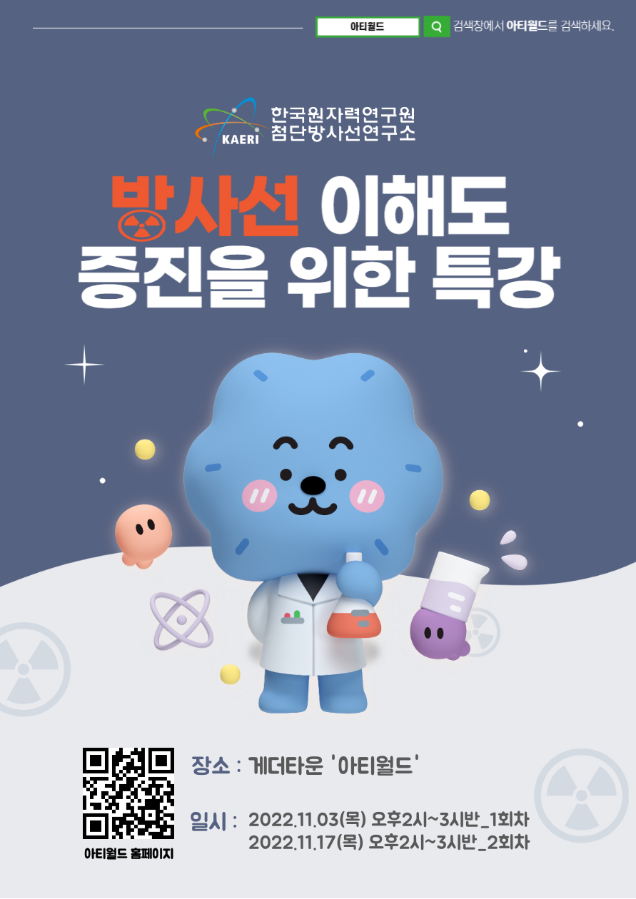 첨단방사선연구소에서 주최한 방사선 이해도 증진을 위한 특강을 비대면으로 진행하려고 하오니 많은 관심과 신청바랍니다. 1. 개요 일정 : 2022.11.03.(목) 오후 2시 \~ 3시 반_1회차 2022.11.17.(목) 오후 2시 \~ 3시 반_2회차 모집 : 상시모집 (선착순 마감)/ 1회차 20명 모집 대상 : 방사선에 관심 있는 누구나 장소 : 메타버스 플랫폼 게더타운 ‘아티월드’ 소강당 주제 : 생활 방사선 강사 : 한국원자력안전재단 소속 초빙교수 2. 내용 세부내용 : 한국원자력연구원 첨단방사선연구소가 개설한 메타버스 플랫폼 인 게더타운‘아티월드’내에서 진행하는 비대면 특강입니다. 홈페이지 : 첨단방사선연구소 ‘아티월드’ 공식 홈페이지 아티월드 (muv.kr) 신청링크 : 구글폼 접수 1회차 https://forms.gle/o6Fj6CWbfLBtFfiL8 2회차 https://forms.gle/Lk3sx7odQEVoC28i7