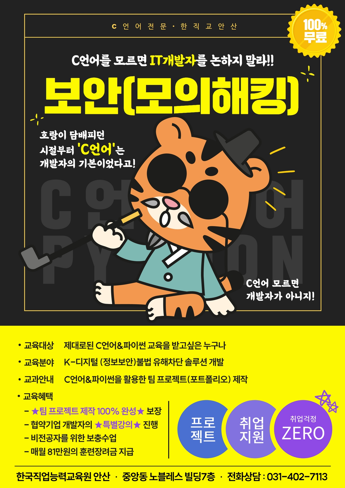 한직교 안산과 IT 보안솔루션 개발업체 및 협회와 협약하여, 비전공자도 실무교육을 배워서 소프트웨어개발자, 네트워크 엔지니어로 취업할 수 있도록 도움을 주는 과정입니다.