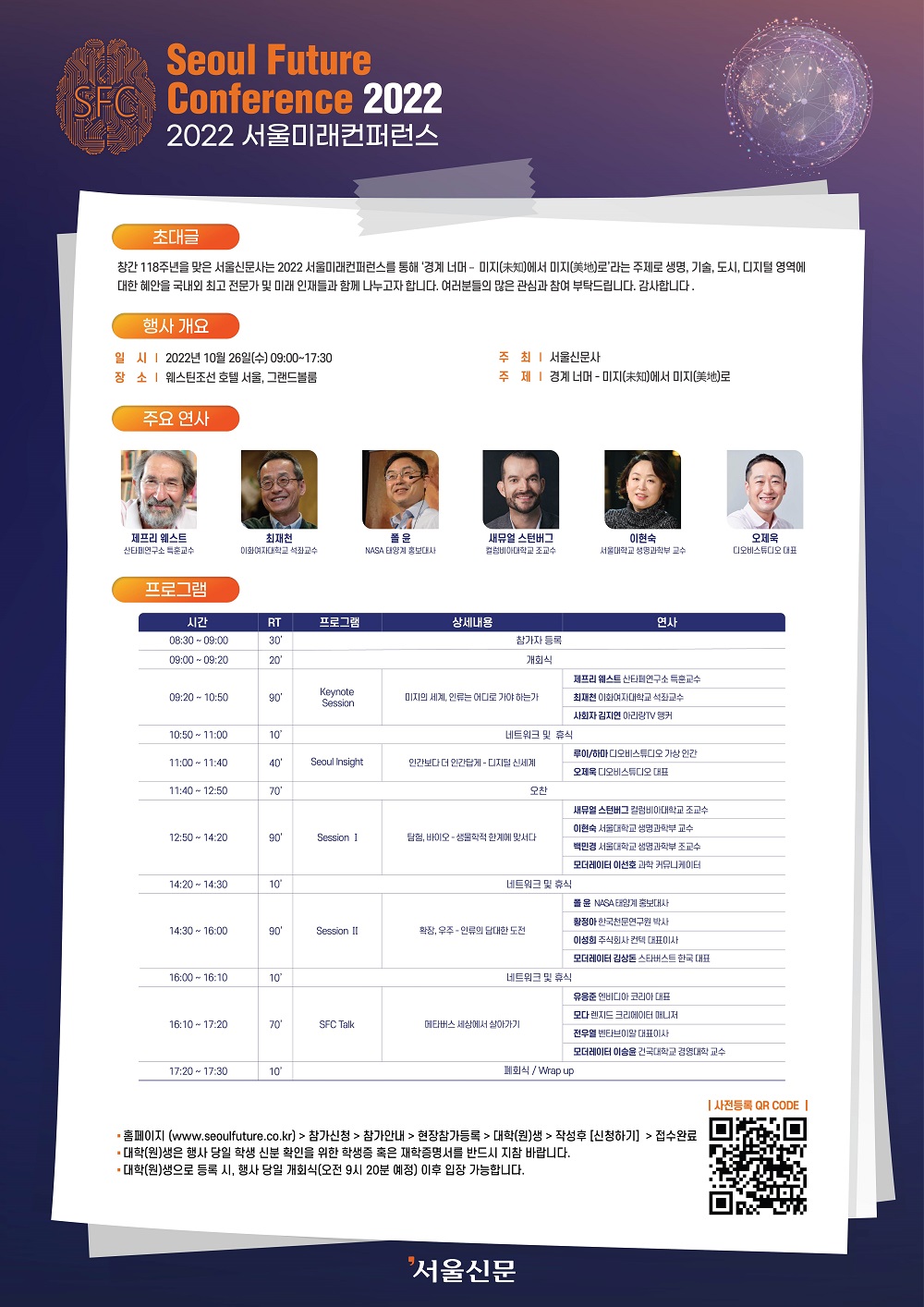 올해로 창간 118주년을 맞은 서울신문사가 주최 및 주관하는 2022 서울미래컨퍼런스는 ‘경계너머 - 미지(未知)에서 미지(美地)로’ 라는 주제로 생명, 기술, 도시, 디지털 영역에 대한 혜안을 국내외 최고 전문가 및 미래 인재들과 함께 나누는 의미있는 자리입니다. 여러분들의 많은 관심과 참여를 부탁드립니다.