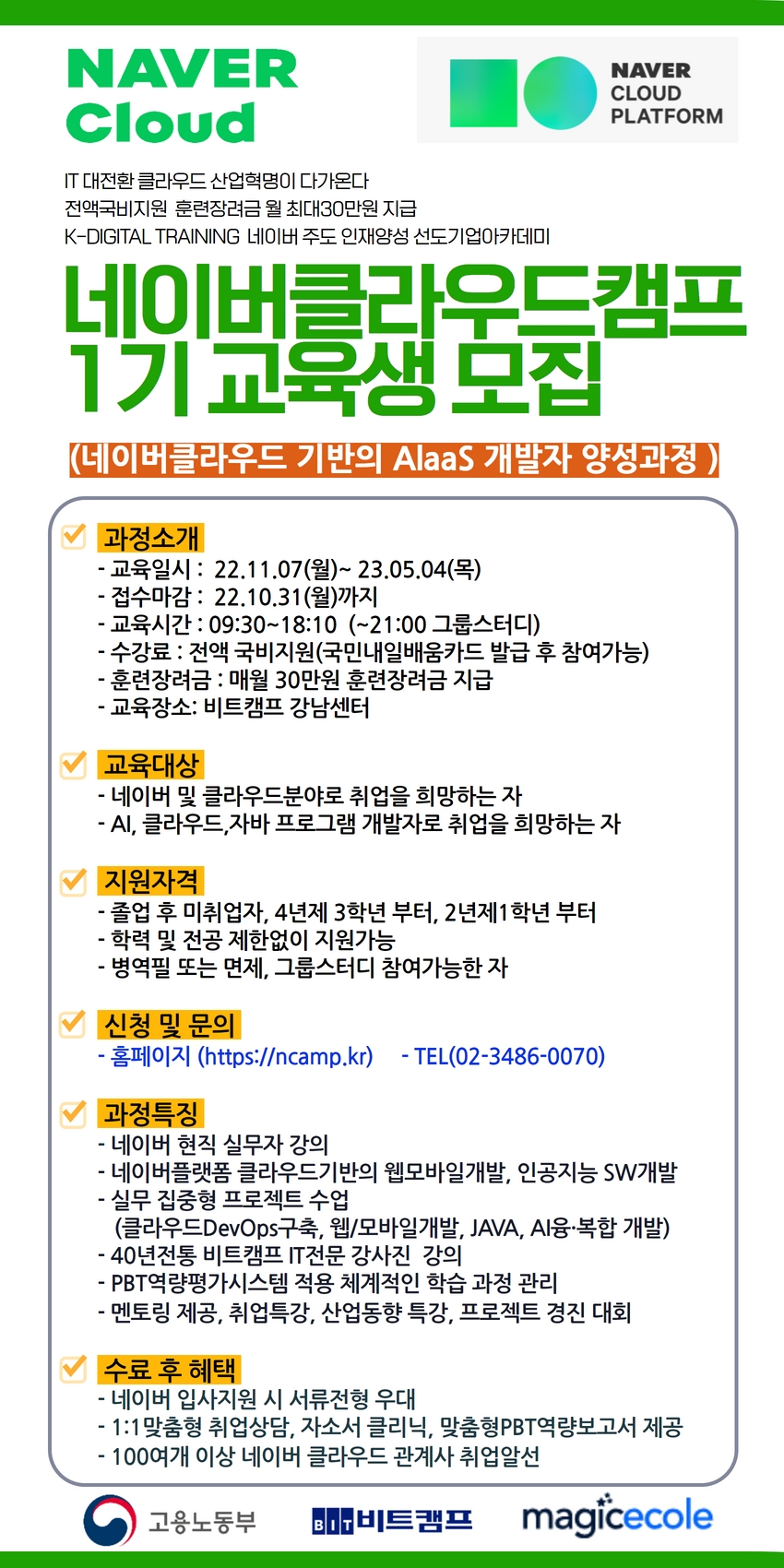 대한민국 K-Digital Training 네이버클라우드와 비트캠프가 함께합니다. 40년전통 IT인재양성의 전설 비트캠프 전문강사진 강의, 프로젝트실무중심수업,실무역량습득으로 수료 후 바로 취업까지!! 비전공자, 전공자 모두 네이버클라우드캠프로 오세요\~ ★네이버클라우드캠프 1기 교육생모집★ *과정명 : [네이버클라우드]클라우드기반AIaaS 개발자 과정 - 교육일정 : 22.11.07(월)\~23.05.04(목) - 접수기간 : 1기 현재접수중\~22.10.31(월) 18시 - 교육장소 : 비트캠프 강남센터 (주소 : 서울시 강남구 강남대로 94길20 삼오빌딩 6층) - 상담전화: 02-3486-0070 *과정특징 -전액국비지원무료 -훈련장려금 매월30만원 지급 -네이버클라우드 현업 실무진 현장강의 -40년전통 IT전문 비트캠프 유명강사 명강의 -실무중심형 프로젝트기반 수업 -수료후 네이버클라우드와 관계사, 비트인력풀IT기업 취업연계 -접수기간: 1기 현재접수중\~22.10.31(월) 18시 *자세한 교육내용 및 신청은 -네이버클라우드캠프 https://bit.ly/3MQdFGP 신청접수 가능! -https://bit.ly/3DipKBO 에서 신청접수 가능! -국민내일배움카드로 교육신청·참여가능! -상담전화: 02-3486-0070