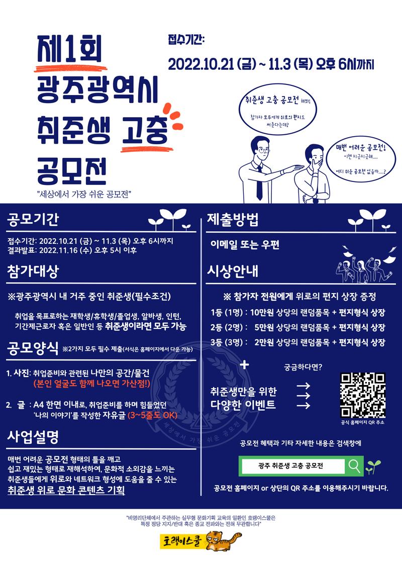 2. 일 정 : ‧ 공모전 접수기간: 2022. 10. 21.(금) \~ 11. 3.(목) 오후 6시 까지 ‧ 공모전 결과발표: 2022. 11. 16.(수) 오후 5시 이후 문자로 개별 통지 ‧ 온라인 공모전 전시: 2022. 11. 9.(수) 희망자에 한하여 공식 홈페이지에 순차적 게시** ※ 온라인 공모전 전시 관련 정보는 차후에 공지 드릴 예정 3. 응모자격 : ※ 필수자격요건 : 광주광역시에 거주 중인 취준생 ‧ 취업준비를 우선순위로 둔 광주광역시 관내 재학생/휴학생/졸업생 ‧ 인턴 혹은 아르바이트를 병행하고 있는 광주광역시 취준생 ‧ 정규직 취직을 위해 취업준비를 겸하고 있는 광주광역시 내 기간제근로자 ‧ 기타 취준생으로 여겨지는 광주광역시 일반 시민 ※ 연령 제한은 없음, 개인만 참여 가능, 개인 1명당 응모 수는 1편으로 제한 4. 공모전 양식 제출 안내(※ 2가지를 반드시 제출해주셔야 합니다)