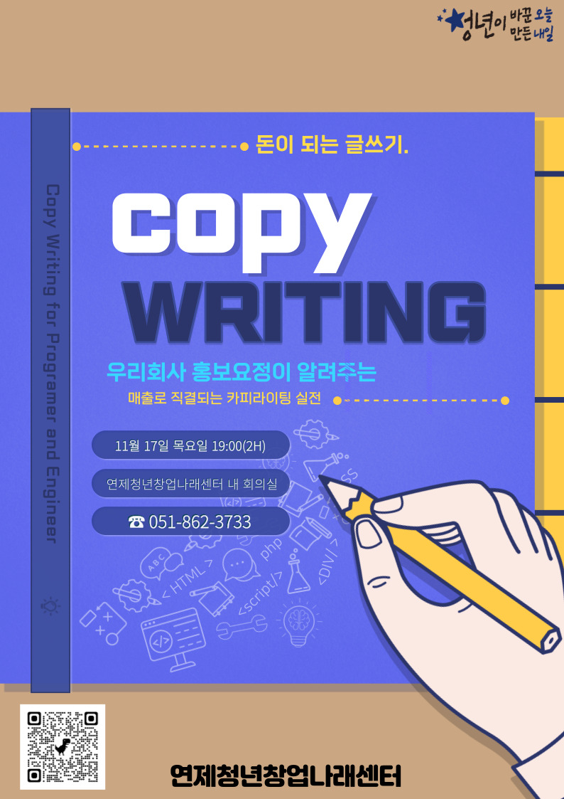 안녕하세요. 연제청년창업나래센터입니다. <11월 오픈클래스>관련 프로그램 안내드립니다! 이번 강의 또한 온·오프라인으로 진행될 예정이며 오프라인 수업 장소는 연제청년창업나래센터 내 회의실입니다. 11월 오픈클래스 2회차 강의 "돈이 되는 글쓰기, 카피라이팅" 우리 회사 홍보요정이 알려주는 -매출로 직결되는 카피라이팅 실전-