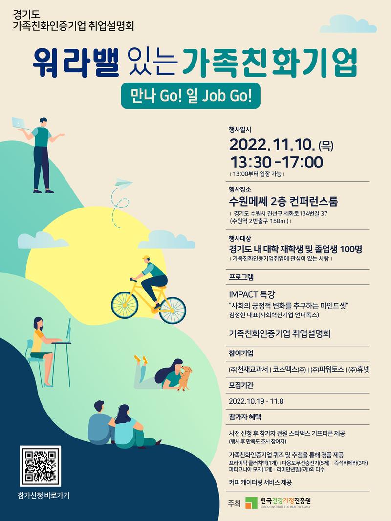 | 시간 | 운영 프로그램 | 세부내용 | | --- | ------- | ---- | | \~13:30 | 접수 | 접수 및 참가자 등록, 사전 설문조사 진행 | | 13:30\~13:35(10‘) | 오프닝 | 행사 취지 및 소개 | | @rows=2:13:35\~14:00(20‘) | @rows=2:가족친화기업 A to Z | 가족친화제도 및 기업 소개 | | 퀴즈&경품이벤트 | | @rows=2:14:10\~16:00(110‘) | @rows=2:가족친화기업 설명회 | 참가기업 별 20분씩 기업소개 | | (질의응답 포함 총 2시간 이내 진행) | | 16:00\~16:50(50‘) | Impact 특강 | 사회혁신기업 언더독스 김정헌 대표 | | 16:50\~17:00(10‘) | 만족도조사 | 온라인 만족도 조사 | | 17:10 | 클로징 | 마무리 인사 및 |