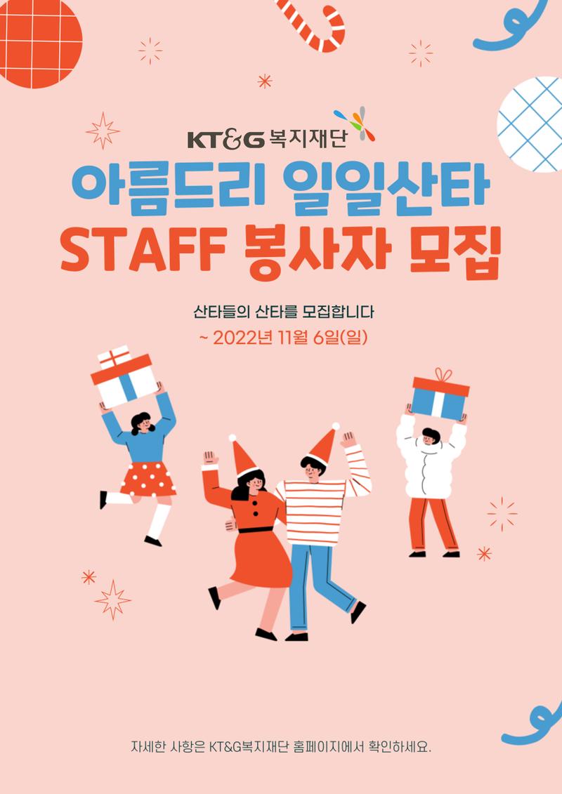 KT&G복지재단에서는 2022년 아름드리 일일산타 STAFF 봉사자를 모집합니다.