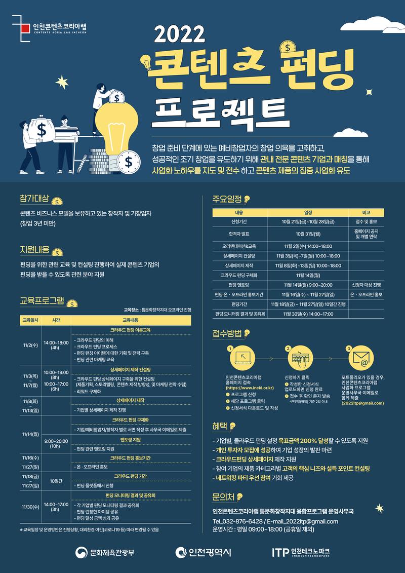 [인천콘텐츠코리아랩] 2022 콘텐츠 펀딩 프로젝트 모집공고 (\~10/28) 창업 준비 단계에 있는 예비창업자의 창업 의욕을 고취하고 성공적인 조기 창업을 유도하기 위해 관내 전문 콘텐츠 기업과 매칭을 통해 사업화 노하우를 지도 및 전수하고 콘텐츠 제품의 집중 사업화 유도