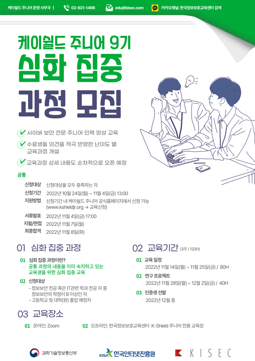 과학기술정보통신부가 주최하고 한국인터넷진흥원이 주관하는 K-Shield Jr. 교육은 향후 정보보호 분야 취업시 현장실무를 즉각 수행할 수 있는 사이버 보안 전문 주니어 인력 양성을 목표로 하는 프로그램입니다.