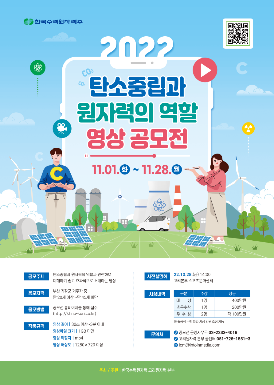 ● 응모주제 - 탄소중립과 원자력의 역할과 관련하여 이해하기 쉽고 효과적으로 소개하는 영상 ● 응모자격 - 부산 기장군 거주자 중 만 20세 이상\~만 45세 미만 ● 접수방법 - 공모전 홈페이지를 통해 접수 http://khnp-kori.co.kr/ ● 작품규격 -영상 길이 : 30초 이상\~3분 이내 -영상 크기 : 1GB 미만 -영상 확장자 : MP4(아이폰 사용자는 공모전 홈페이지 FAQ 참고) -영상 해상도 : 1280 X 720 이상 ● 사전설명회 안내 - 2022년 10월 28일(금) 14:00 - 고리본부 스포츠문화센터 ● 시상내역 대상 - 1명, 400만원 최우수상 - 1명, 200만원 우수상 - 2명, 각 100만원 * 출품작 수에 따라 시상 인원 조정 가능 ● 문의처 - 공모전 운영사무국 : 02-2233-4019 / lcm@intoinmedia.com - 고리원자력 본부 콜센터 : 051-726-1551\~3