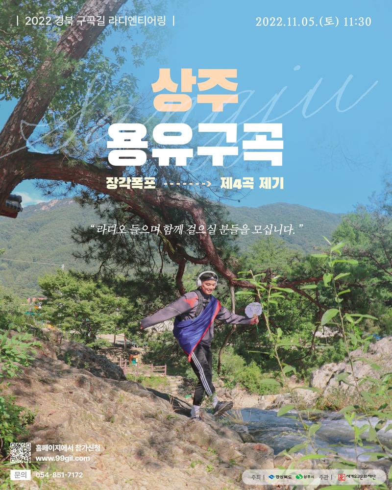 [상주 용유구곡] ⠀ 올해 마지막 구곡길 행사, 상주 용유구곡에서 라디오 들으며 걸어봐요! ⠀ - 구곡길 : 산림 내 경치가 아름답거나 깊은 뜻이 담긴 아홉 개의 굽이 길 - 라디엔티어링 : 라디오+오리엔티어링의 합성어로\, 라디오를 들으며 길을 걷는 프로그램 ⠀ 자연속에서 펼쳐지는 축하공연 단풍속에서 라디오를 들으며 걷고 도착지엔 플리마켓 먹거리와 푸짐한 경품 이벤트도 기다리고 있습니다. ⠀ http://99gil.com/ 현재 구곡길 홈페이지에서 사전 접수를 받고 있습니다. 마지막 회차인 만큼 풍성하게 준비했으니 놀러오세요 ⠀ 5회차 문경 2022.10.29 (토) 11:30 6회차 상주 2022.11.05 (토) 11:30 ⠀ 홈페이지 - 회원가입 후 누구나 무료로 참가 신청 가능하니, 많이 참여해 주세요! *대구 반월당 \~ 상주 행사장 왕복 셔틀버스가 무료로 지원되니 참고 부탁드립니다 :) ⠀ 문의사항 : 담당자 연락처 010-3412-1499 / @gugokgil 인스타그램 DM