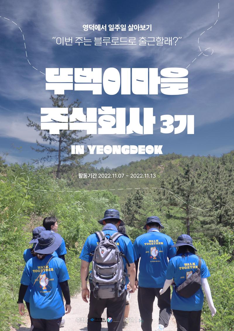 영덕에서 일주일 살아보기 “이번 주는 블루로드로 출근할래?” 뚜벅이마을 주식회사 3기 모집 ⠀ 🌊 모집 인원 : 10명 🌊 활동 기간 : 2022.11.07.(월) \~ 2022.11.13.(일), 6박 7일 🌊 활동 장소 : 경상북도 영덕군 영해면 성내리 🌊 지원 방법 : 구글폼 지원 (https://url.kr/2daj87) - 뚜벅이마을 웹사이트(walkvillage.com) 공지사항 - 뚜벅이마을 인스타그램 프로필 링크 주소 확인 ⠀ 🌊 지원 혜택 - 게스트하우스 숙박 제공 - 조식 제공 - 웰컴 굿즈 제공 - 뚜벅이 사원증 제공 ⠀ 🌊 참가비 : 무료 (식사 등 개인 생활에 필요한 기본 생활비 지참 필요) 🌊 참가 준비물 1. 활동 기간 중 필요한 의류 및 생필품 2. 활동 기간 중 식사 등에 필요한 개인 활동비 3. 트레킹 시 필요한 운동복 및 운동화 4. 개인비상약(기본적인 비상약은 구비되어 있습니다!) ⠀ 🌊 모집 기간 - 2022.10.20.(목) \~ 2022.11.03.(목) ⠀ 🌊 최종 발표 - 2022.11.04.(금) 12:00 * 뚜벅이마을 웹사이트(walkvillage.com) 공지사항 혹은 개별 문자 확인 ⠀ 🌊 문의 - walkvillage20@gmail.com 혹은 @walk_village DM