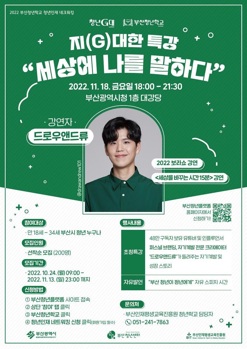 ✔ 참여대상 : 만 18세 \~ 34세 부산시 청년 누구나 (선착순 200명) ✔ 행사내용 : - 초청특강 : 드로우앤드류가 들려주는 자기계발 및 성장 스토리 - 자유발언 : 부산 청년의 자유 스피치 시간 ✔ 시간 : 11월 18일 (금) 18:00 - 21:30 ✔ 장소 : 부산광역시청 1층 대강당 ✔ 모집기간 : 10. 24. (월) 09:00 \~ 11. 13. (일) 23:00