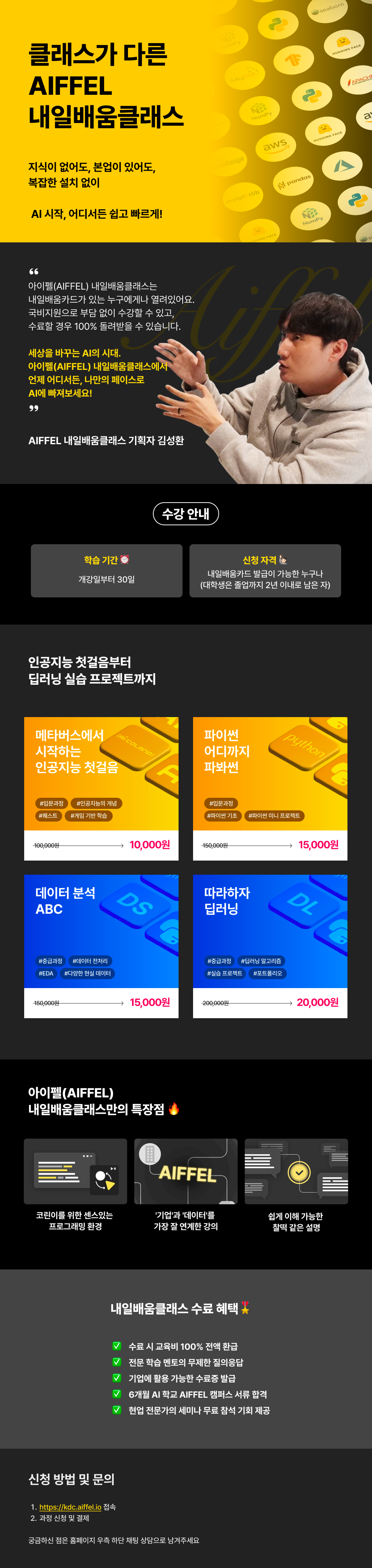 1. 메타버스에서 시작하는 인공지능 첫걸음 (AI 기초개념) 2. 파이썬 어디까지 파봐썬 (파이썬 기초) 3. 머신러닝 기초 with 파이썬 (머신러닝 기초) 4. 쫄지말자 딥러닝 (모두연 김승일 소장님의 딥러닝 이론 + 실습콘텐츠) 5. 따라하자 딥러닝 (8개의 현업중심 딥러닝 프로젝트를 수행) 6. 데이터 분석 ABC (현업 프로젝트 실습 중심 데이터 분석) 7. 캐글러로 가는 데이터 분석 첫걸음 (캐글 프로젝트로 경험하는 데이터분석 실무)