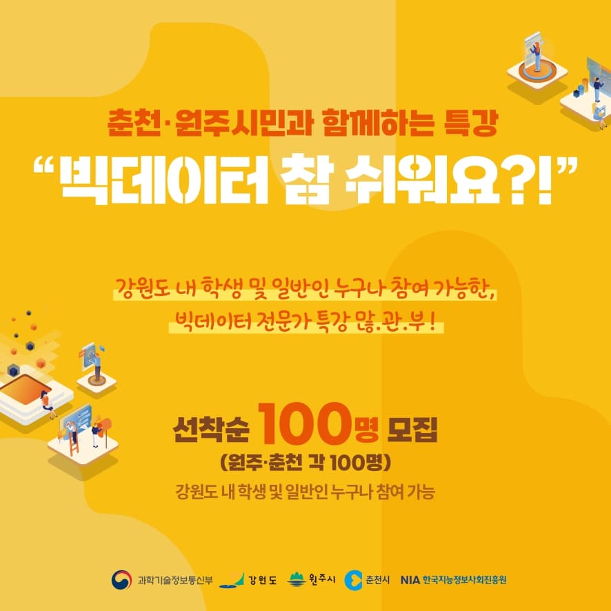 ○ 참가혜택 : 참자가 전원 “스타벅스 1만원권 쿠폰” 제공, “빅데이터 전문가 과정” 6개월 무료 수강 혜택 제공 ○ 추첨제공 : 참가자 중 추첨을 통해 경품 증정 (아이폰 14 1대, 애플워치 3대, 스타벅스 텀블러 30개) ○ 프로그램: 유명 빅데이터 전문가 2인 특강 외 본 프로그램은 2022년도 정부(과학기술정보통신부) 및 지방자치단체(강원도, 원주시, 춘천시) 재원으로 한국지능정보사회진흥원의 지원을 받아 진행합니다.