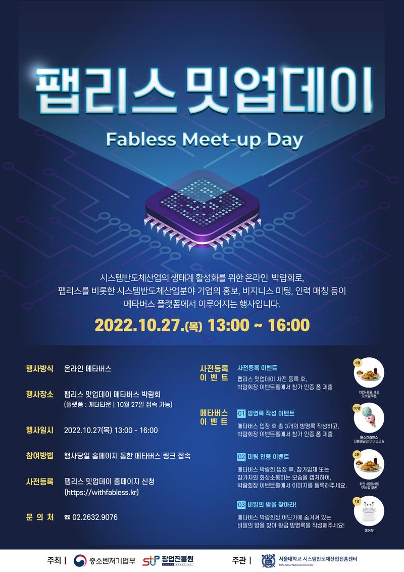 ◎ 행사명 : 팹리스 밋업데이(Fabless Meet-up Day) ◎ 행사일시 : 2022. 10. 27(목) 13:00\~16:00 ◎ 메타버스 플랫폼 : 게더타운(Gather town) ◎ 공식 홈페이지 : https://withfabless.kr ◎ 접속방법 ① 크롬 접속 후 구글 계정 로그인 ② 팹리스 밋업데이 게더타운 링크 접속(무료, 10/27 링크 오픈) ◎ 문의처 : 02-2632-9076