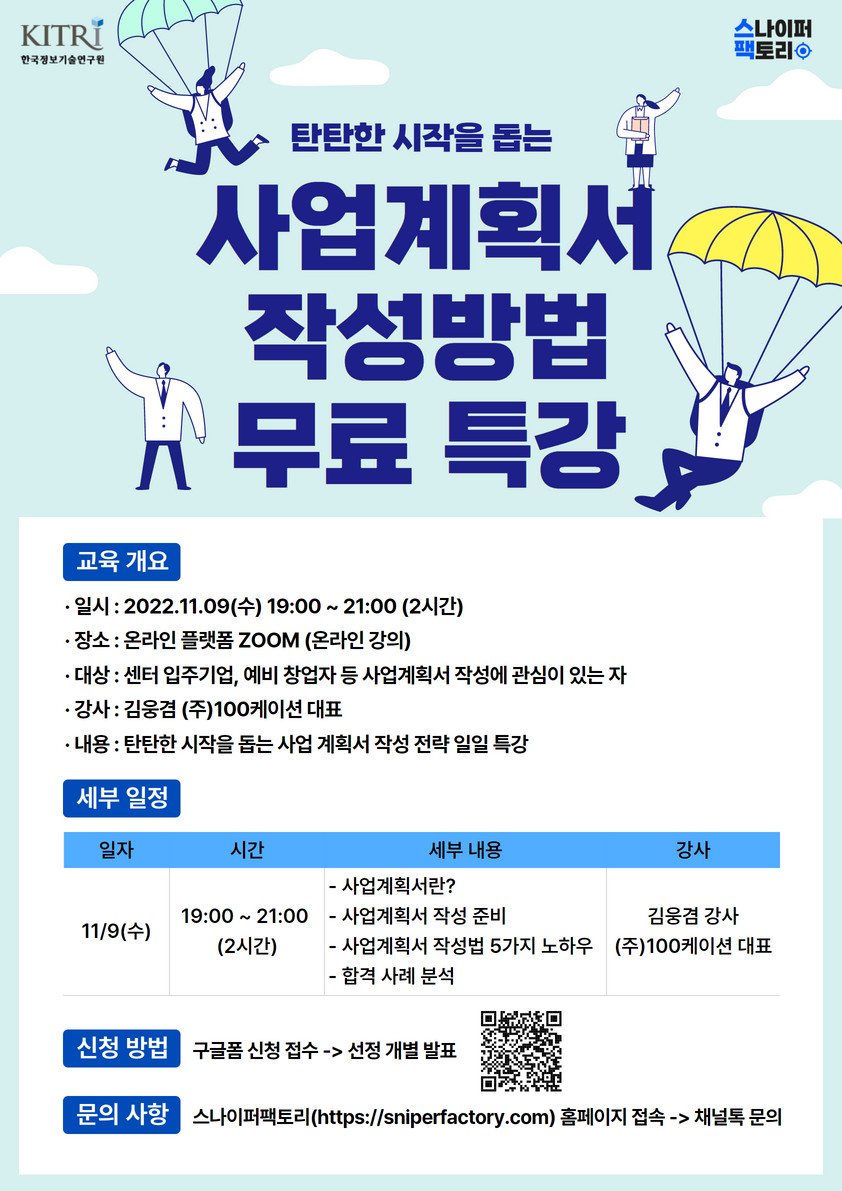 · 일시 : 2022.11.09(수) 19:00 \~ 21:00 (2시간) · 장소 : 온라인 플랫폼 ZOOM (온라인 강의) · 대상 : 센터 입주기업, 예비 창업자 등 사업계획서 작성에 관심이 있는 자 · 강사 : 김웅겸 (주)100케이션 대표 · 내용 : 탄탄한 시작을 돕는 사업 계획서 작성 전략 일일 특강 · 신청 : 구글폼 신청 접수(https://forms.gle/nueSwT232nvPe9sM6) -> 개별 선정 발표 https://forms.gle/nueSwT232nvPe9sM6 · 문의 : 스나이퍼팩토리(https://sniperfactory.com) 홈페이지 접속 -> 채널톡 문의
