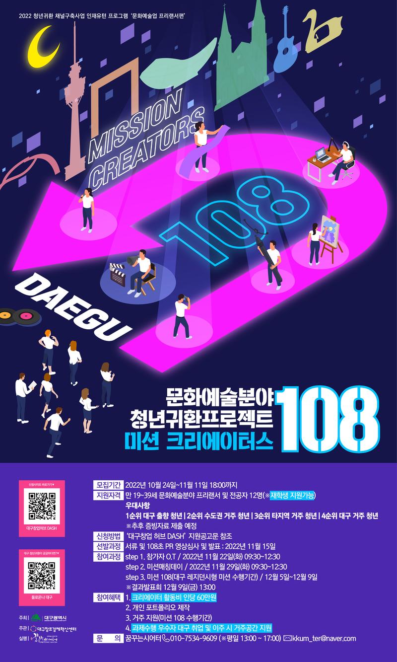 (재)대구창조경제혁신센터 제2022-00호 2022년 청년귀환 채널 구축 사업 문화예술분야 청년귀환 프로젝트 <미션 크리에이터스 108> 참가자 모집 공고 대구광역시와 (재)대구창조경제혁신센터에서는 대구 귀환 또는 이주를 희망하는 문화·예술업에 종사중인 청년 프리랜서를 발굴하고 일거리 연계 및 단기 주거지원을 통해 대구 문화·예술 프리랜서 생태계를 파악하고 장기적 정착기반을 마련할 수 있도록 문화예술 청년귀환 프로젝트 <미션 크리에이터스 108> 참가자 모집을 다음과 같이 공고합니다.
