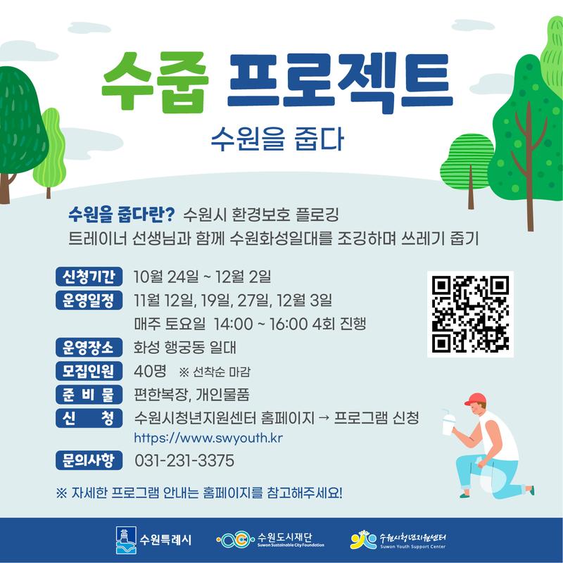 수원 청년 탄소중립 실천 프로젝트 수줍프로젝트 : 수원을 줍다 플로깅 진행!! 트레이너 선생님과 함께 수원화성일대를 조깅하며 쓰레기 줍기 -2시간 플로깅 진행 ✏️접수기간 : 10월 24일 \~ 12월 2일 ✏️진행일시 : 11월 12일, 19일 27일, 12월 3일 원하는 날짜 택1 ✏️진행시간 : 14:00 \~ 16:00 ✏️신청대상 : 수원시 청년 누구나 총 40명 (1회 10명씩 진행) ✏️진행장소 : 화성 행궁동 일대 ✏️준비물 : 편한복장, 개인물품 -선정 결과는 개별 연락을 드릴 예정이며, 신청인원 초과 시 대기번호를 부여합니다. -노쇼/연락 두절 시 본 센터 프로그램에 영구적으로 제한됩니다. 문의 : 031-231-3375