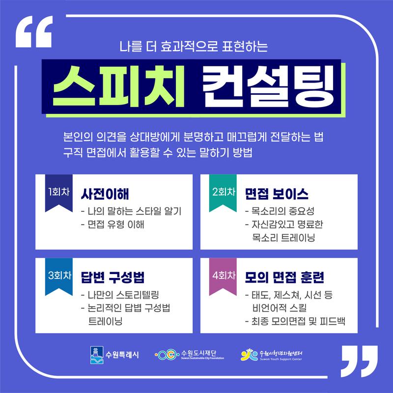수원 청년 퍼스널 브랜딩 프로그램 나를 더 효과적으로 표현하는 스피치 컨설팅 본인의 의견을 상대방에게 분명하고 매끄럽게 전달하는법 구직 면접에서 활용할 수 있는 말하기 방법입니다. ✏️접수기간 : 10월 24일 \~ 11월 13일 ✏️진행일시 : 1기 ⟶ 11월 7일, 8일 9일 10일 10:00 \~ 12:00 2기 ⟶ 11월 7일, 8일 9일 10일 14:00 \~ 16:00 3기 ⟶ 11월 14일, 15일, 16일 17일 10:00 \~ 12:00 4기 ⟶ 11월 14일, 15일, 16일 17일 14:00 \~ 16:00 기수별 4회 진행, 원하는 기수 중 택 1 ✏️신청대상 : 수원시 청년 누구나 총 32명 (1기수 당 8명) ✏️진행장소 : 청년바람지대 (경기도 수원시 팔달구 효원로 249번길 38, 동광빌딩 2층) -선정 결과는 개별 연락을 드릴 예정이며, 신청인원 초과 시 대기번호를 부여합니다. -노쇼/연락 두절 시 본 센터 프로그램에 영구적으로 제한됩니다. -문의 : 031-231-3375