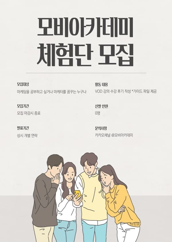 ◆체험단 안내 ◆모집 대상ㅣ마케팅을 공부하고 싶은 누구나 ◆제공 혜택ㅣ모비아카데미 강의 15일 수강권 ◆모집 기간ㅣ모집 마감시 종료 ◆발표 기간ㅣ상시 개별 연락 ◆체험 기간ㅣ강의 지급일로부터 15일 ◆후기 미션ㅣ네이버 블로그 1회 작성 *작성가이드 파일 제공 ◆신청 방법ㅣ홈페이지 접수 ◆문의 사항ㅣ카카오채널 @모비아카데미